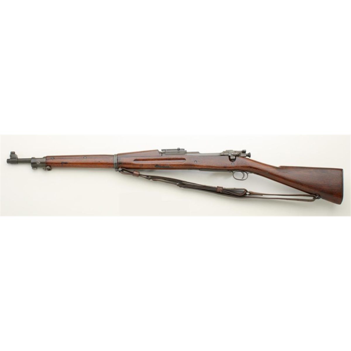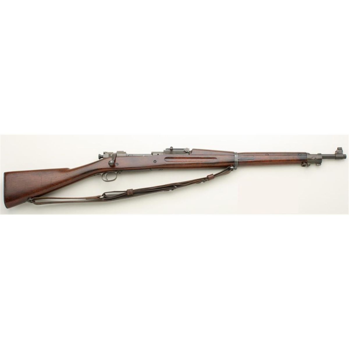 US model 1903 Springfield .30-06 caliber bolt-action military issue rifle, serial #974739. The rifle shows a high-standard marked WWII replacement barrel dated 8-44. The rifle has been arsenal rebuilt and shows95% parkerized finish, just some slight losses on the edges of the triggerguard. The stock shows good “SA” “GAW” cartouche with ordnance wheel right above the trigger. Some small parts were also arsenal replaced attime of refurbish. Condition is very good plus overall. The stocks show just some minor scratches, storage marks. Two “P” inspections behind trigger guard. Very good plus overall. The markings are sharp, borebright. With Boyt 1944 dated sling. The Marine Corps ended up with the majority of these rebuilt WWII 1903s. Dr. Sterling Fenn collection. Est: $400 - $800