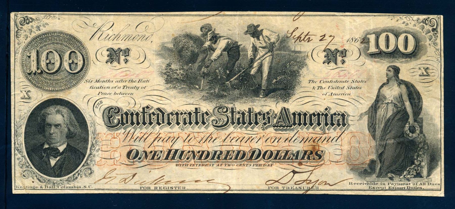 USA $100.00 1862 T-41 Confederate States of America Banknote Very Fine+