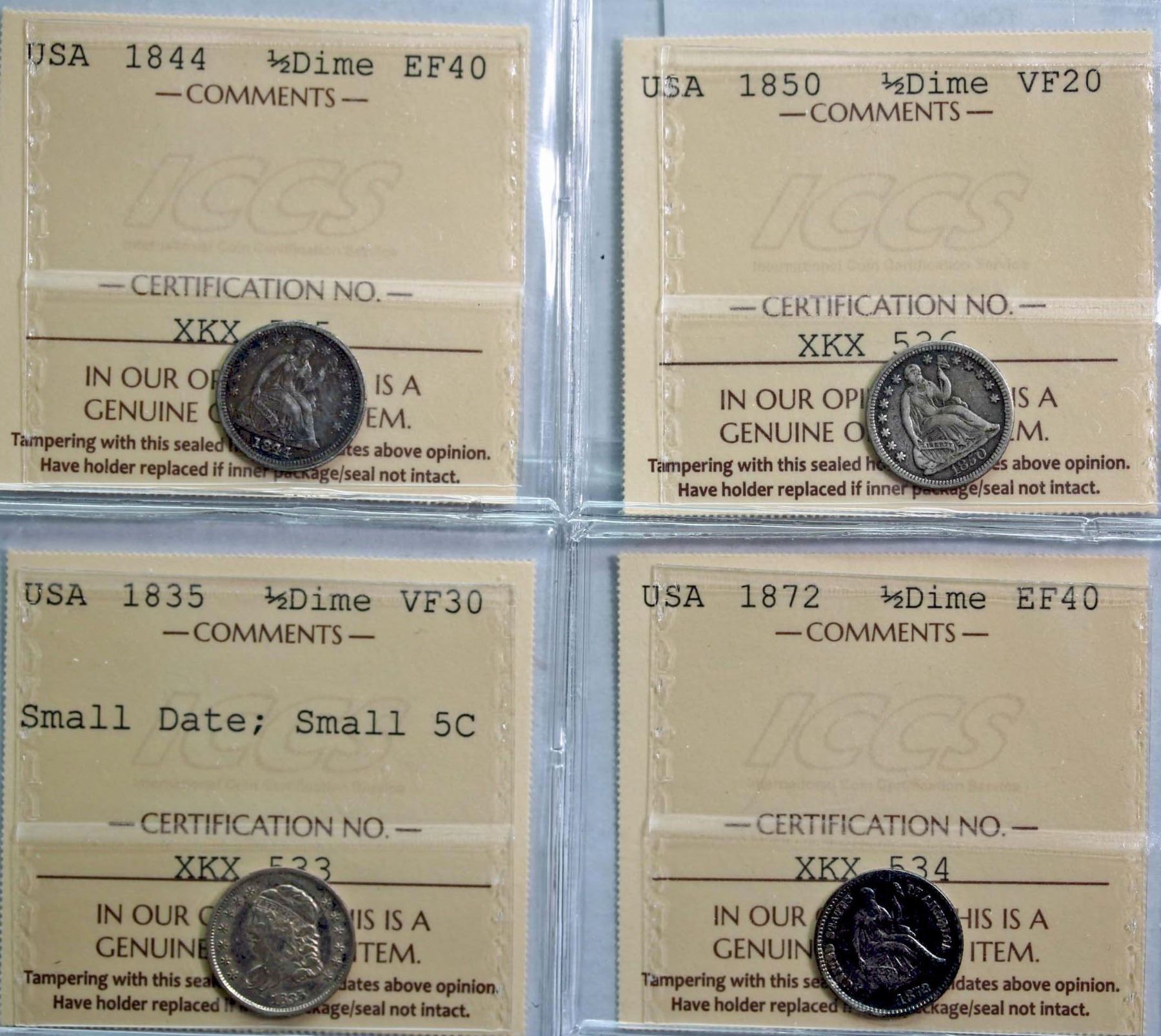 USA; 1835 small date - small 5c Half dime ICCS VF30, 1844 1/2 dime ICCS EF40, 1850 1/2 dime ICCS VF20, 1872 1/2 dime ICCS EF40. Lot of 4 coins.