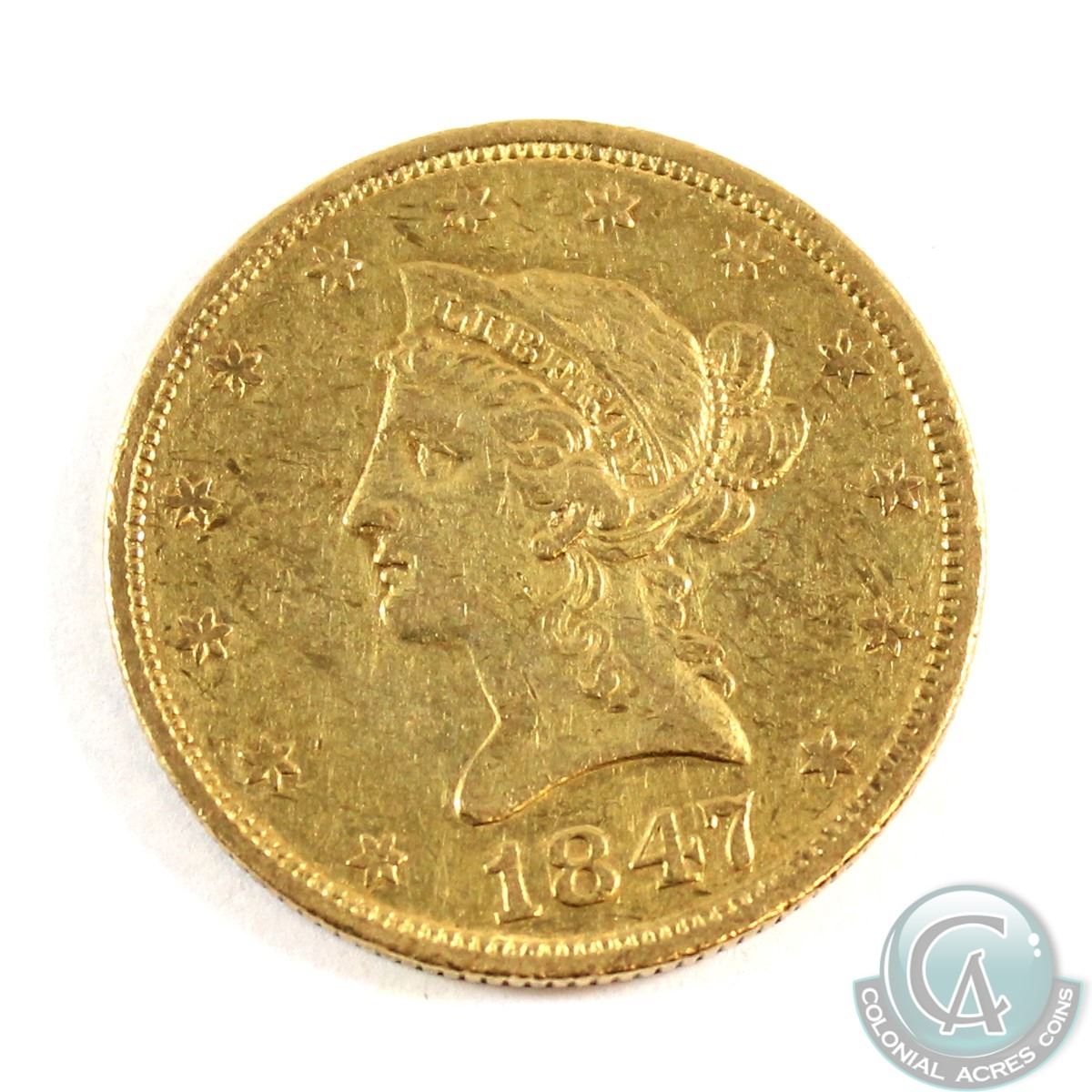 $10 Gold, 1847 Eagle in Extra Fine Condition. Coin is. 900 Fine and contains 0.4839 oz. of Pure Gold.