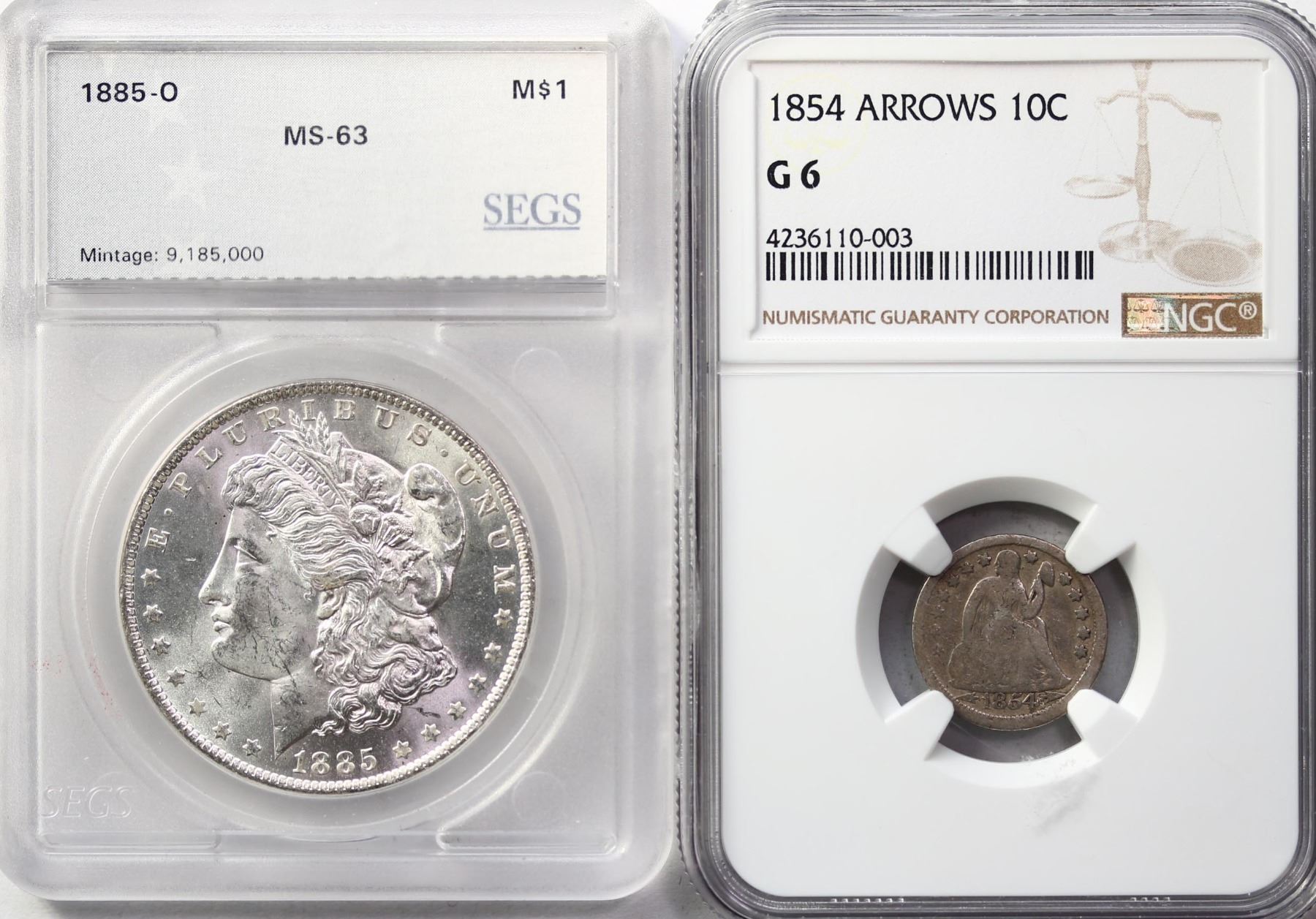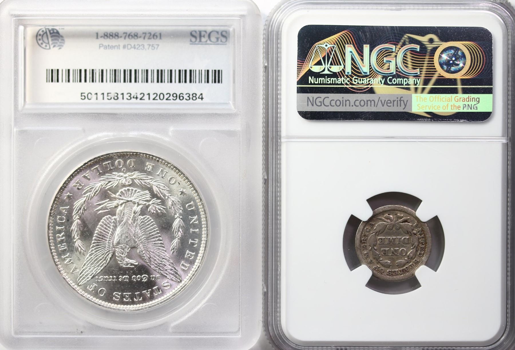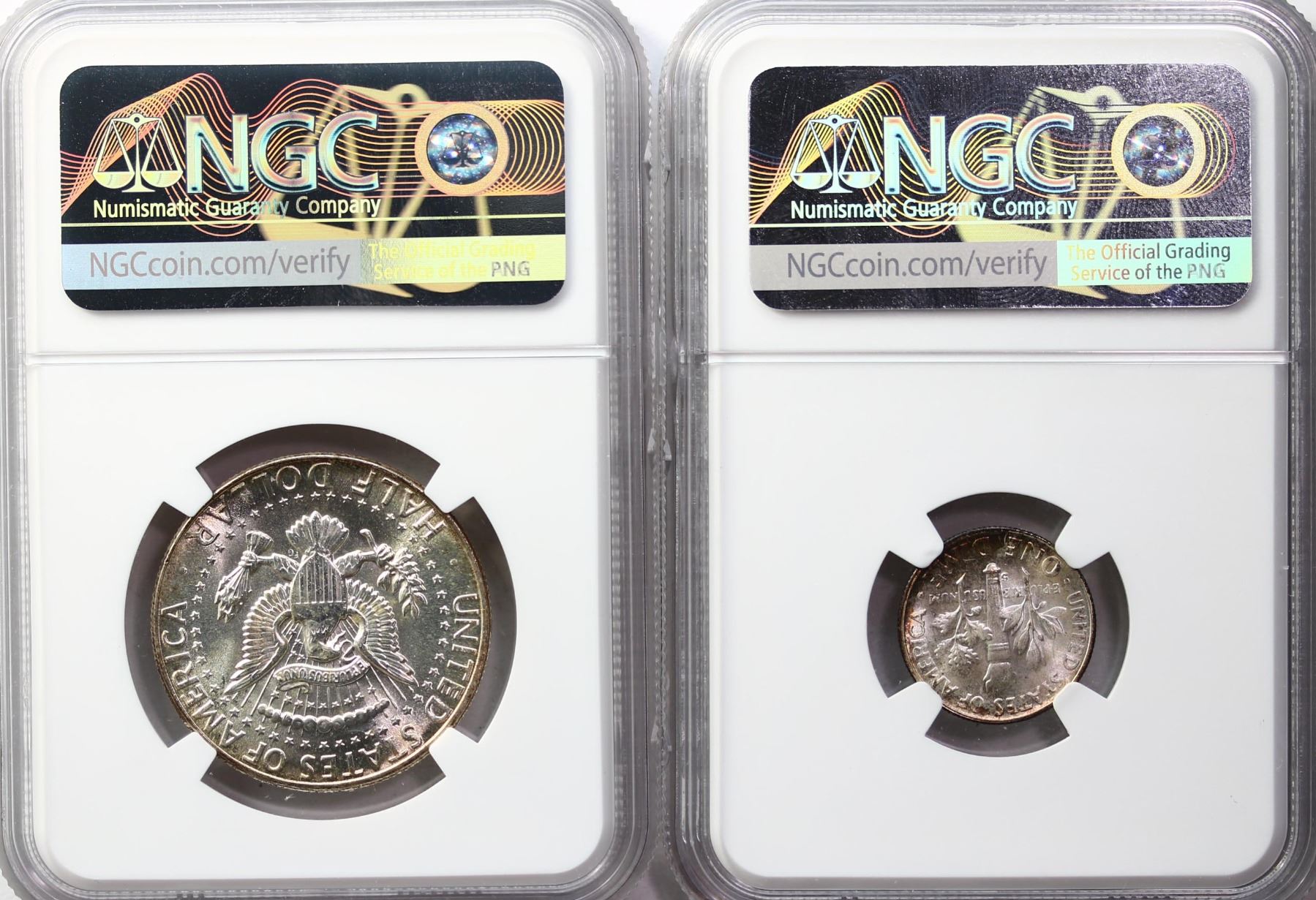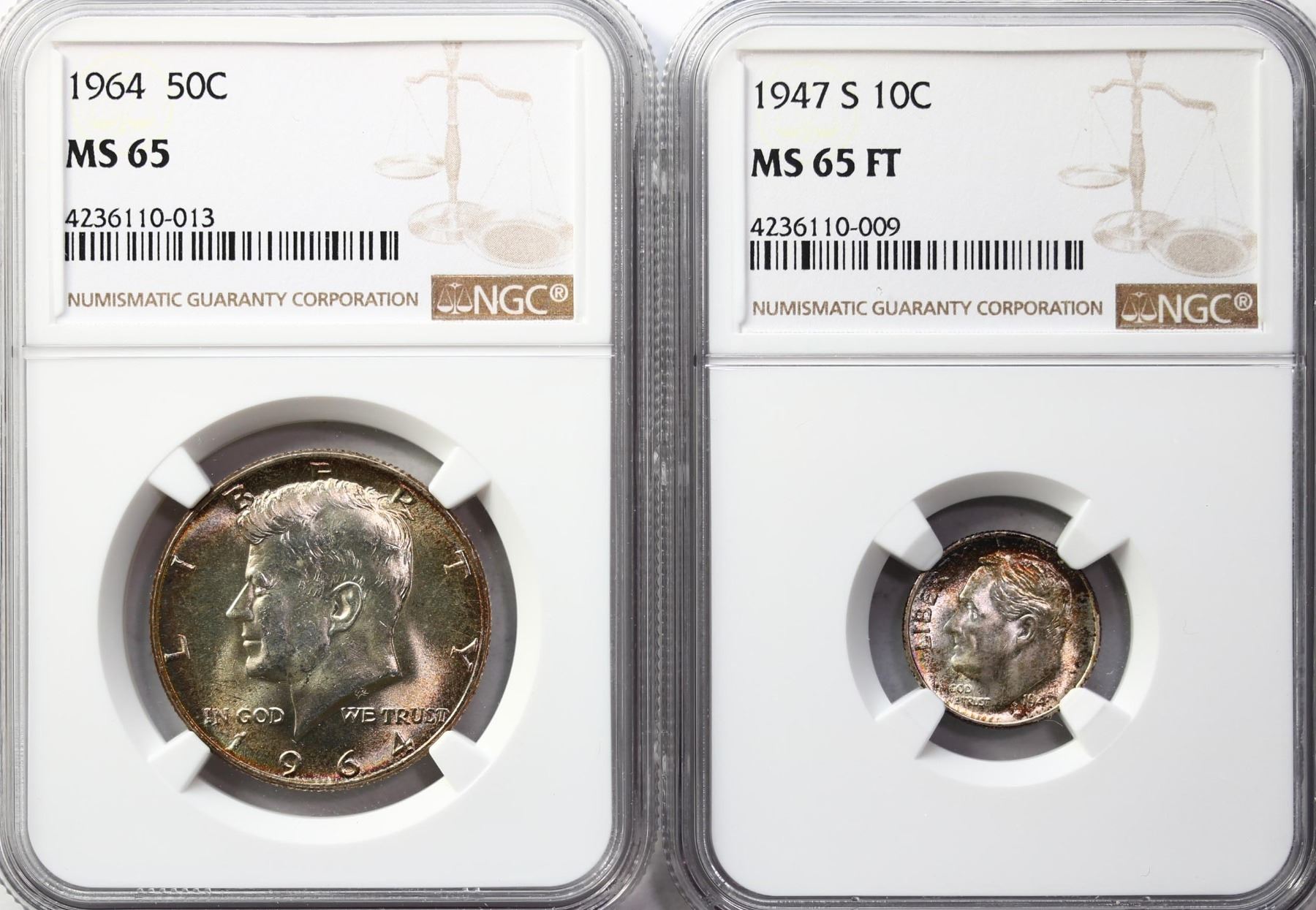USA: 1854 10¢ G6, 1947S 10¢ MS65FT & 1964 50¢ MS65. Lot of 3 NGC graded coins along with 1885-O $1 SEGS MS63. 4 coins in total.
