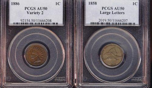 USA, 1858 Large letters, 1886 Variety 2 1¢, both PCGS graded AU50.