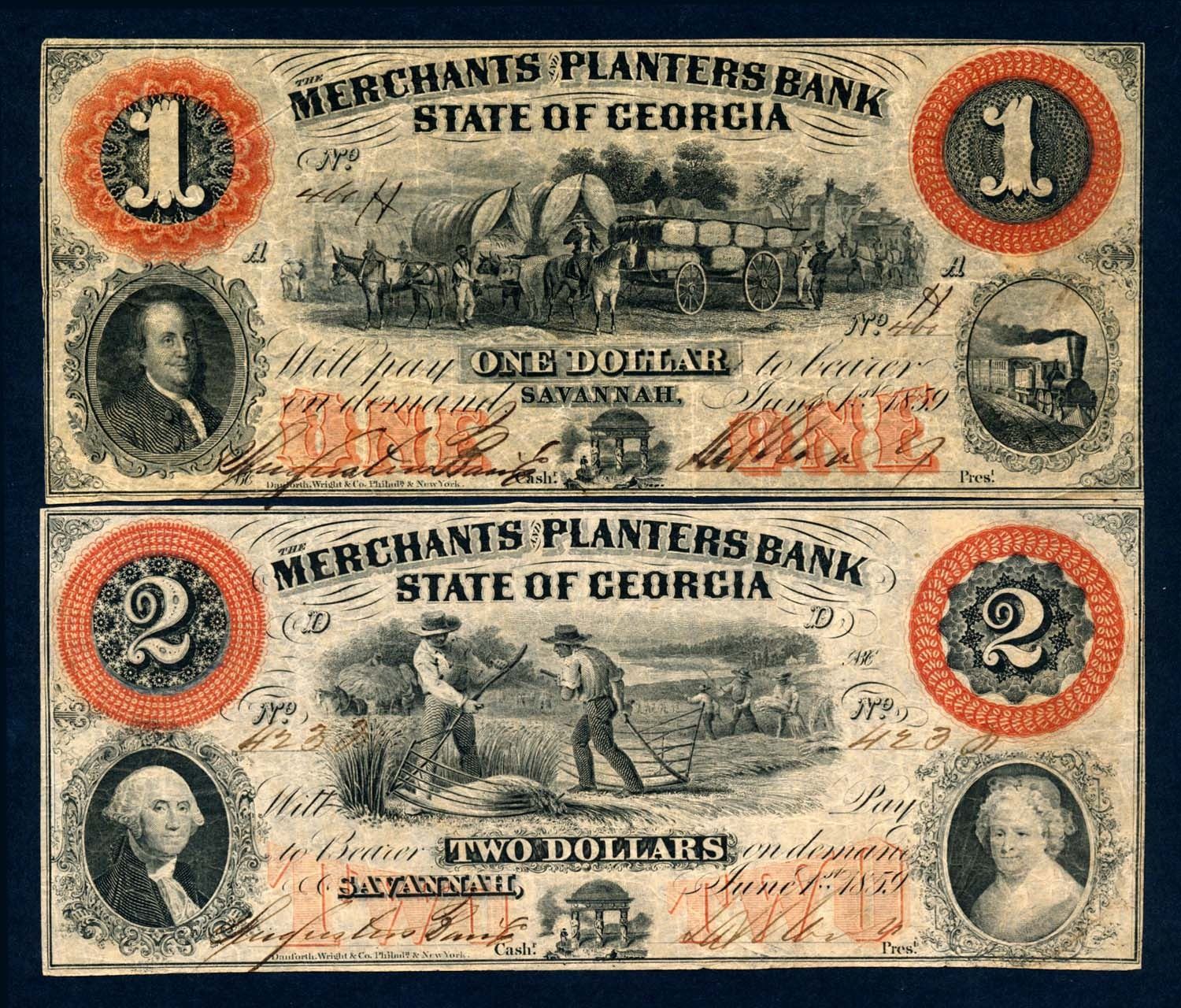 USA 1859 State of Georgia A Lot of 2 Merchants and Planters Bank Banknotes VF+