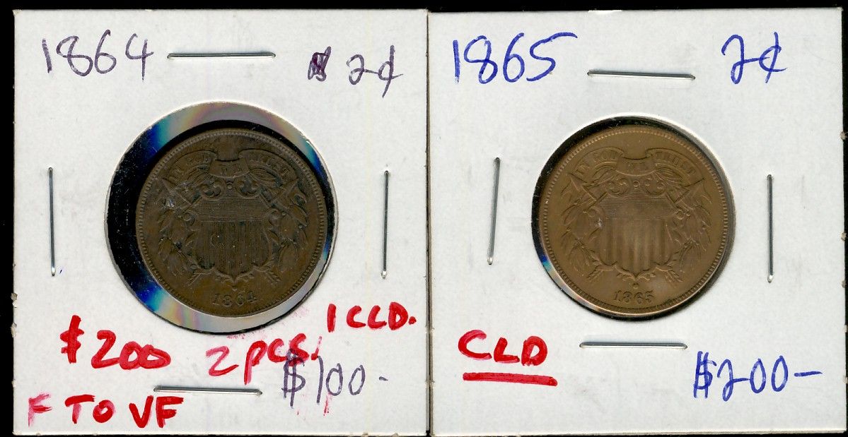 USA 1864 2¢ & 1865. Lot of 2 coins F to VF.