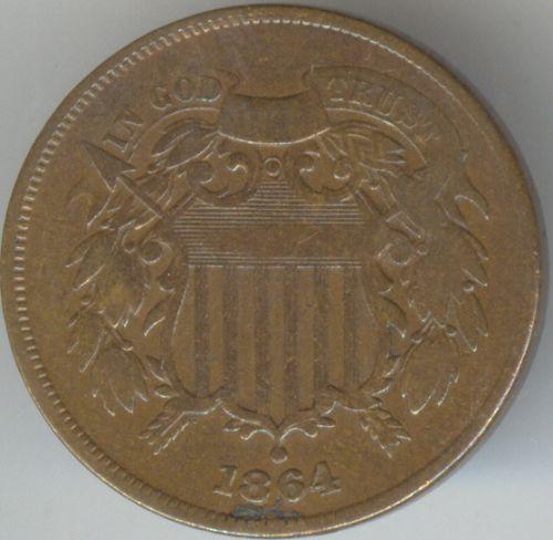 1864 2 cent, large motto in fine to very fine condition. Unlisted variety: top of left ribbon above "In God" not engraved in die.