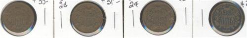 USA 1864 2¢ x 3 & 1869 2¢ , Lot of 4 coins ranging from VG to F in grade.