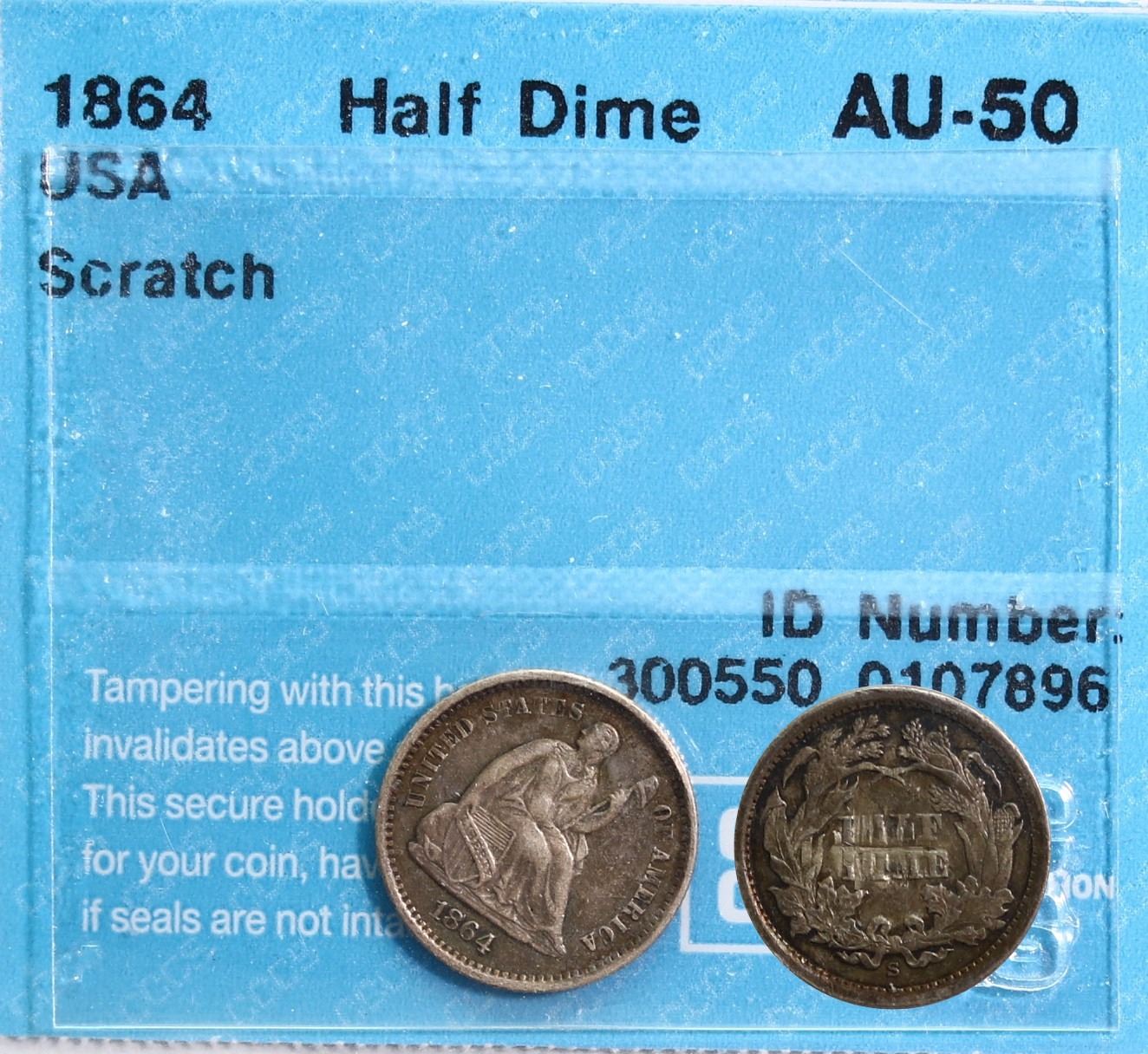USA; 1864 Half Dime CCCS AU50 Scratch