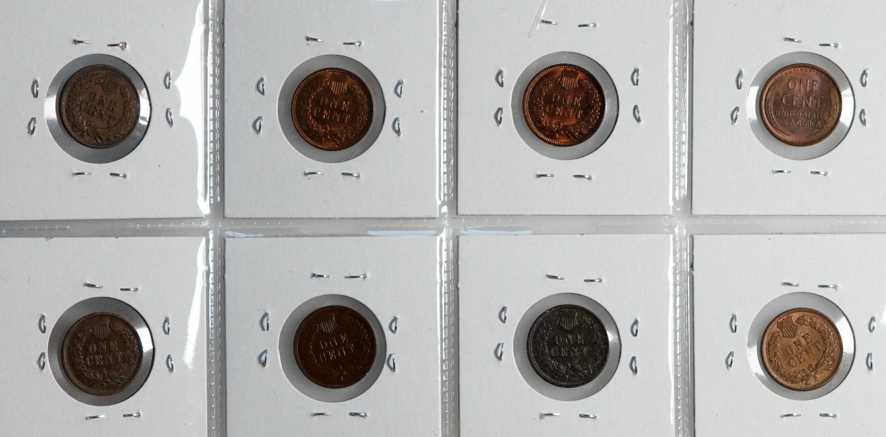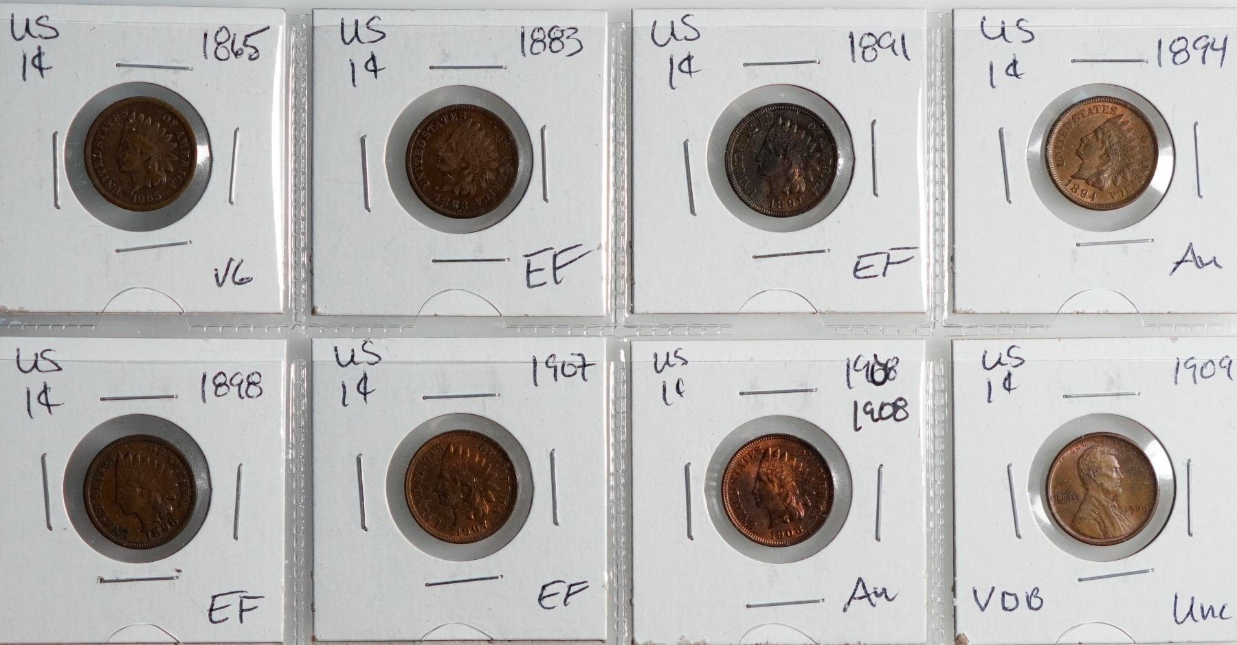USA 1865 1¢, 1883, 1891, 1894, 1898, 1907, 1908, and 1909 VDB, all VG to UNC, lot of 8 coins.