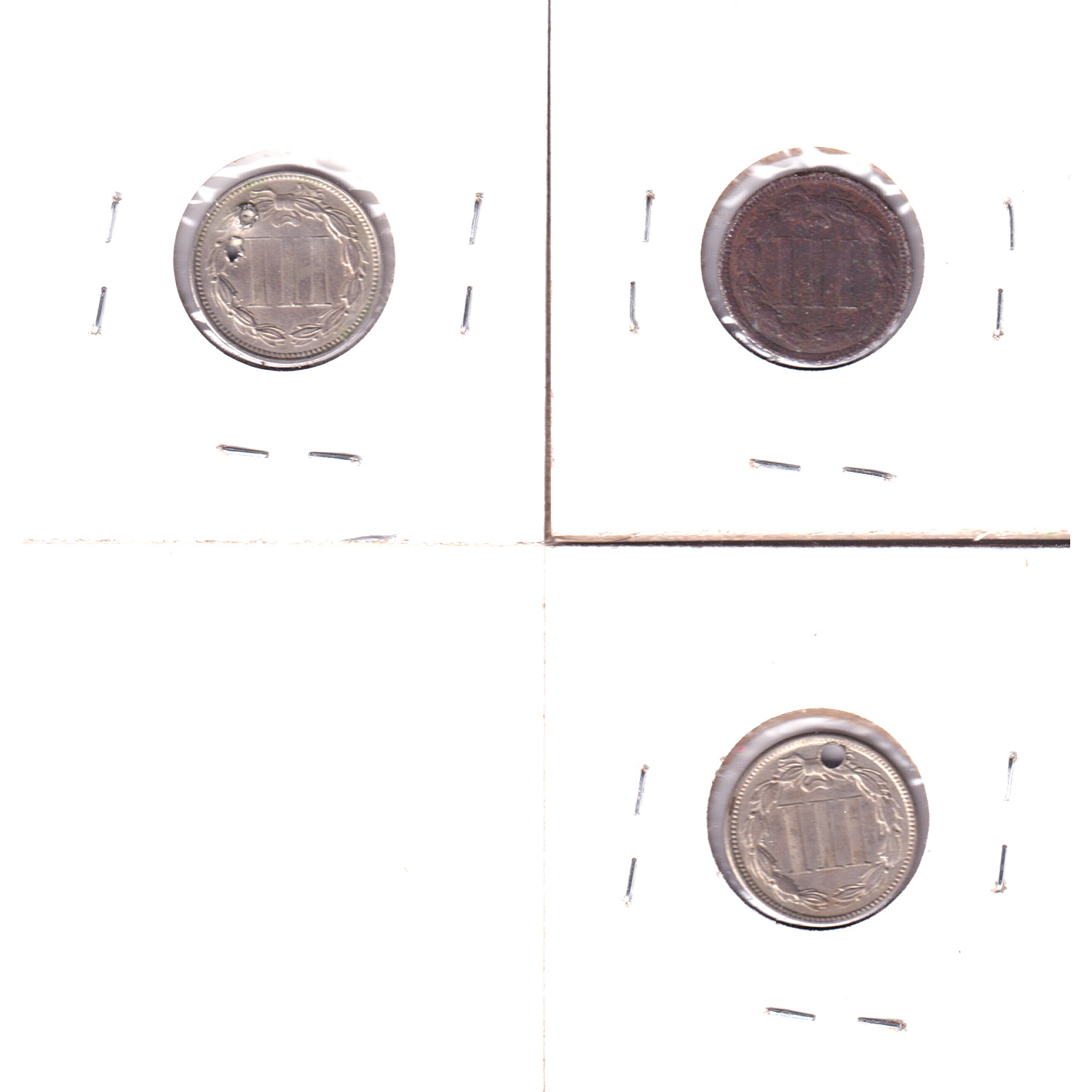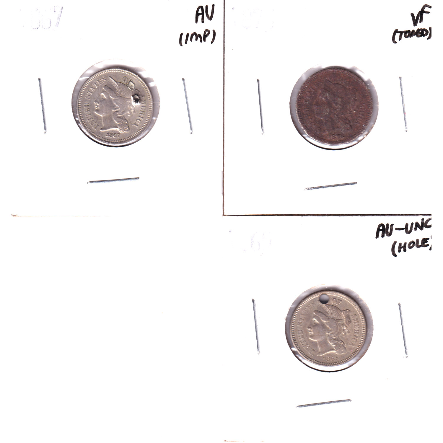 INCLUDES: 1865 AU-UNC (Hole), 1867 AU (Impaired), & 1876 VF (Toned). 3pcs