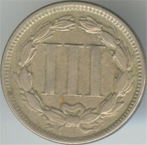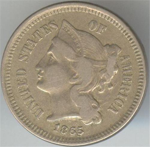 1865 3 cent, in very fine condition. Unlisted varety: double date.