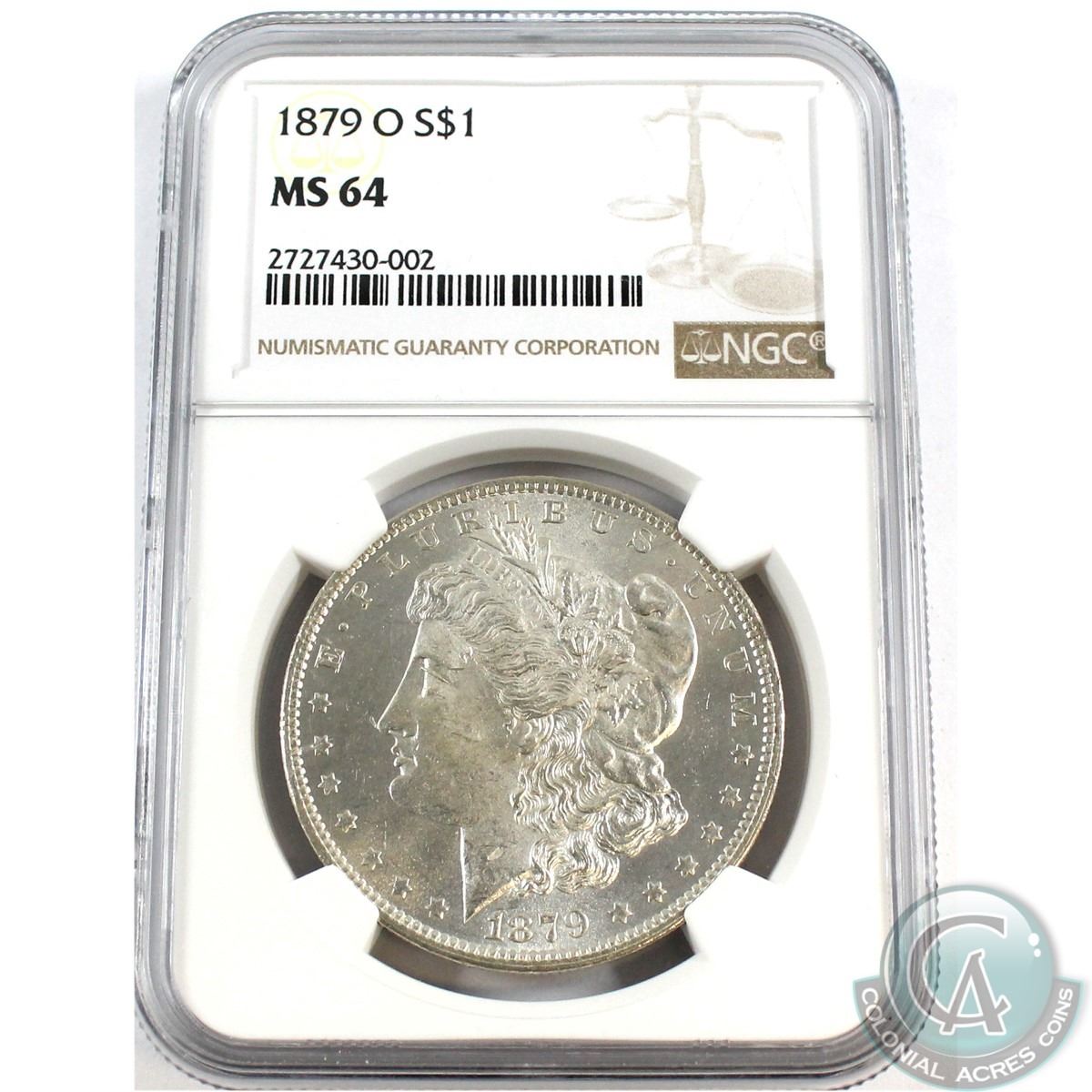 USA; 1879-O Silver $1 NGC Certified MS-64. A Bright flashy coin accented with slight cameo reliefs.