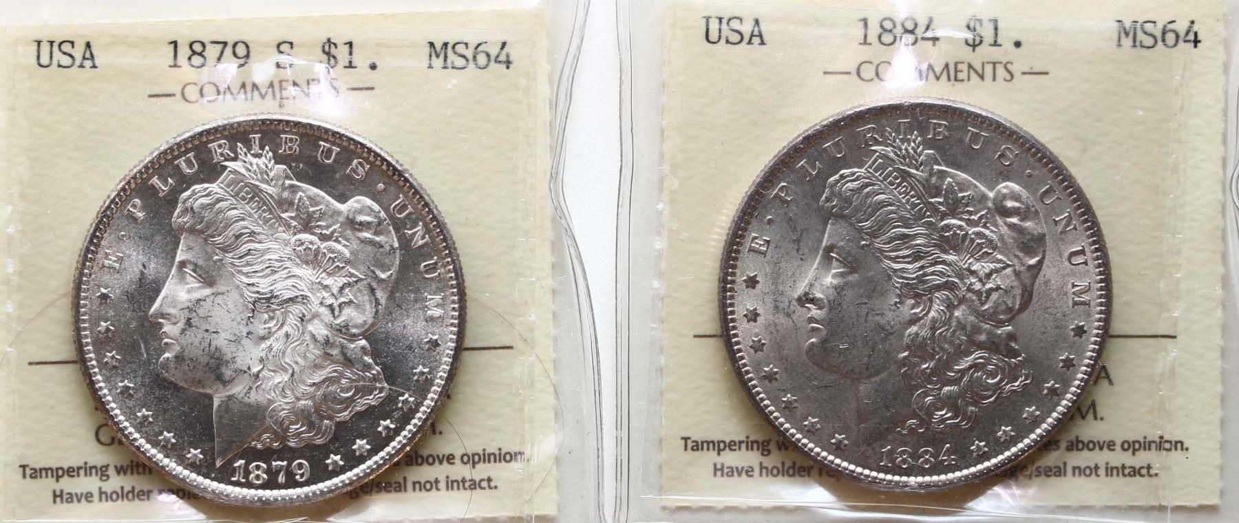 USA; 1879-S $1, 1884. Both coins ICCS MS64
