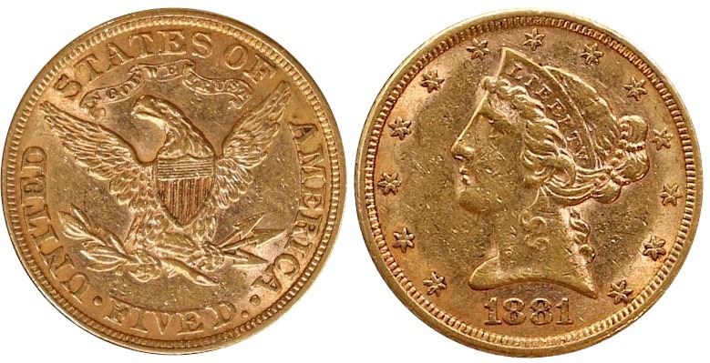USA; 1881 $5 Gold issue. EF to WF+ w/lots of lustre.
