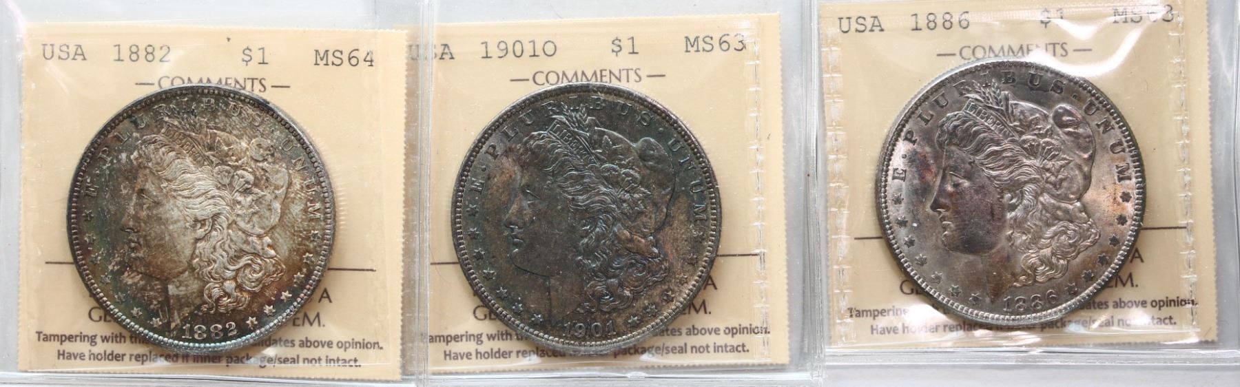 USA; 1882 $1, 1886, 1901-O All 3 coins toned and all ICCS graded MS63 & MS64.