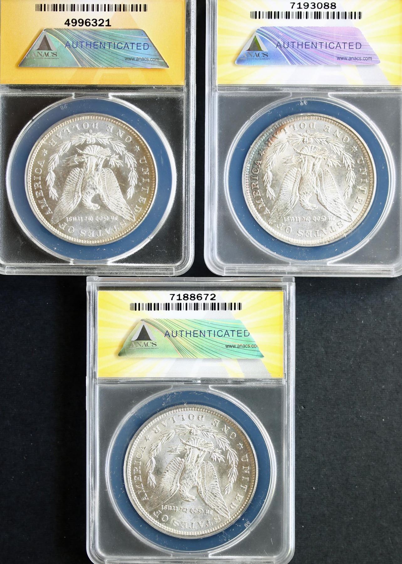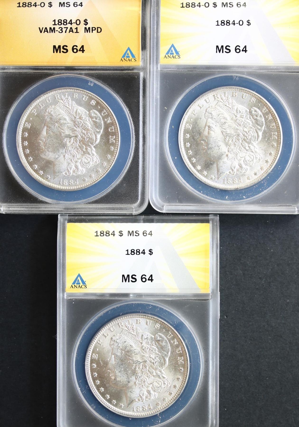 USA; 1884-O $1 VAM-37A1 MPD, 1884-O & 1884 all ANACS Choice Mint State-64 graded. Lot of 3 Bright white and lustrous examples.