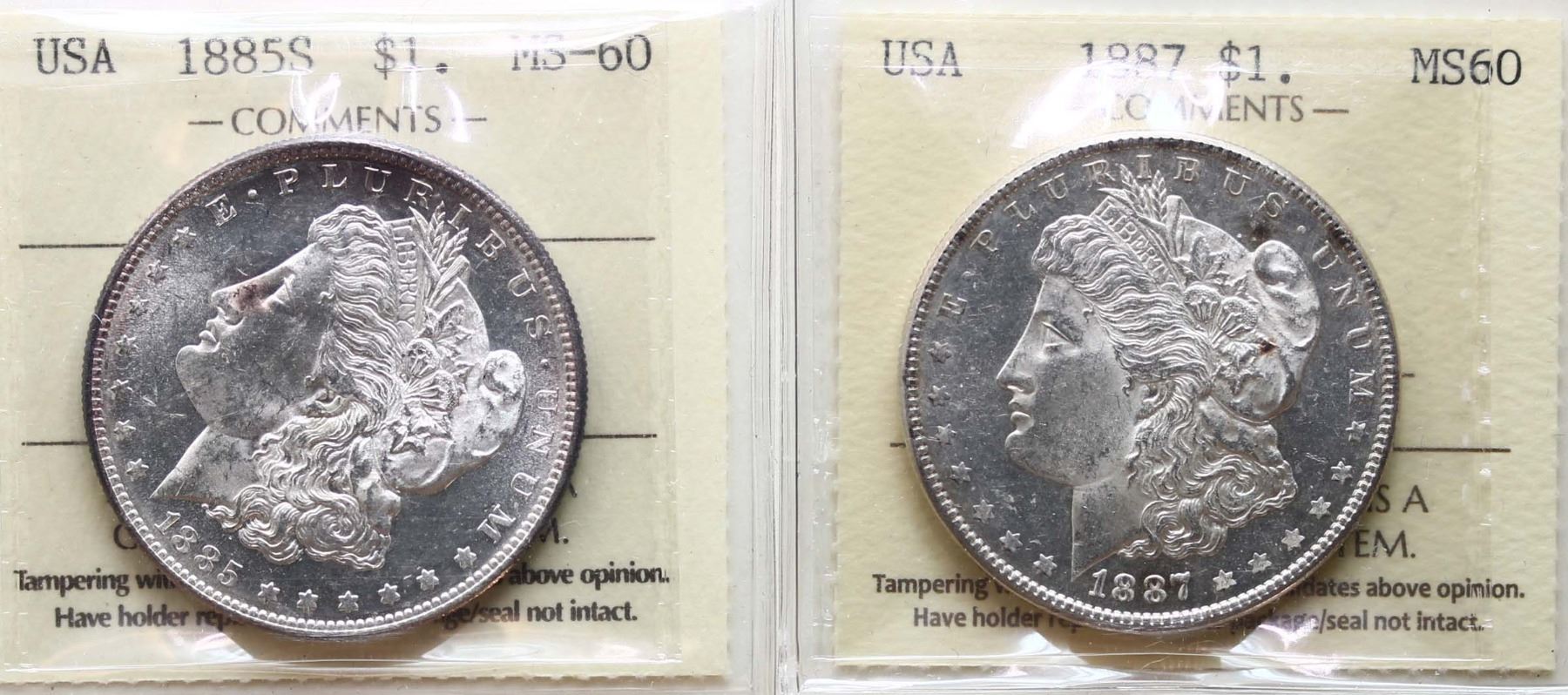 USA; 1885-S $1, 1887. Both coins ICCS MS60