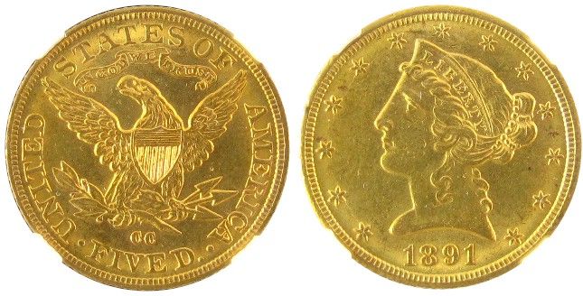 USA 1891CC $5 Gold NGC MS62. Scarce date.