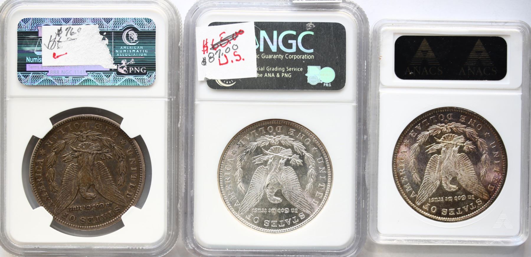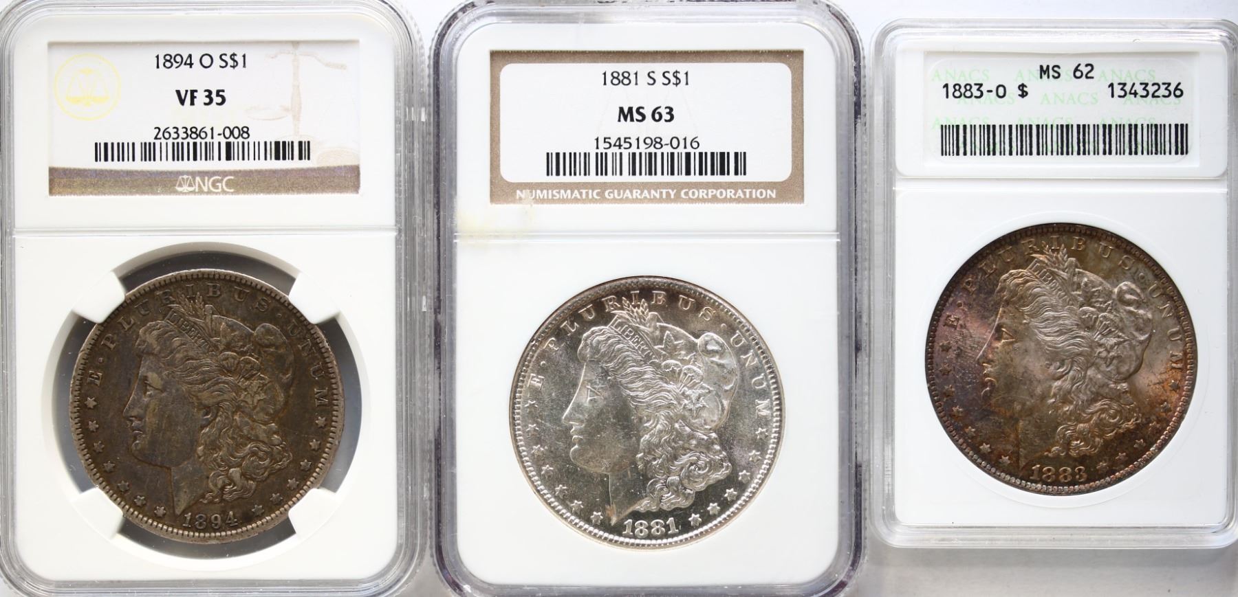 USA; 1894-O $1 NGC VF35, 1881-S NGC MS63, and 1883-O ANACS MS62, lot of 3 coins graded.