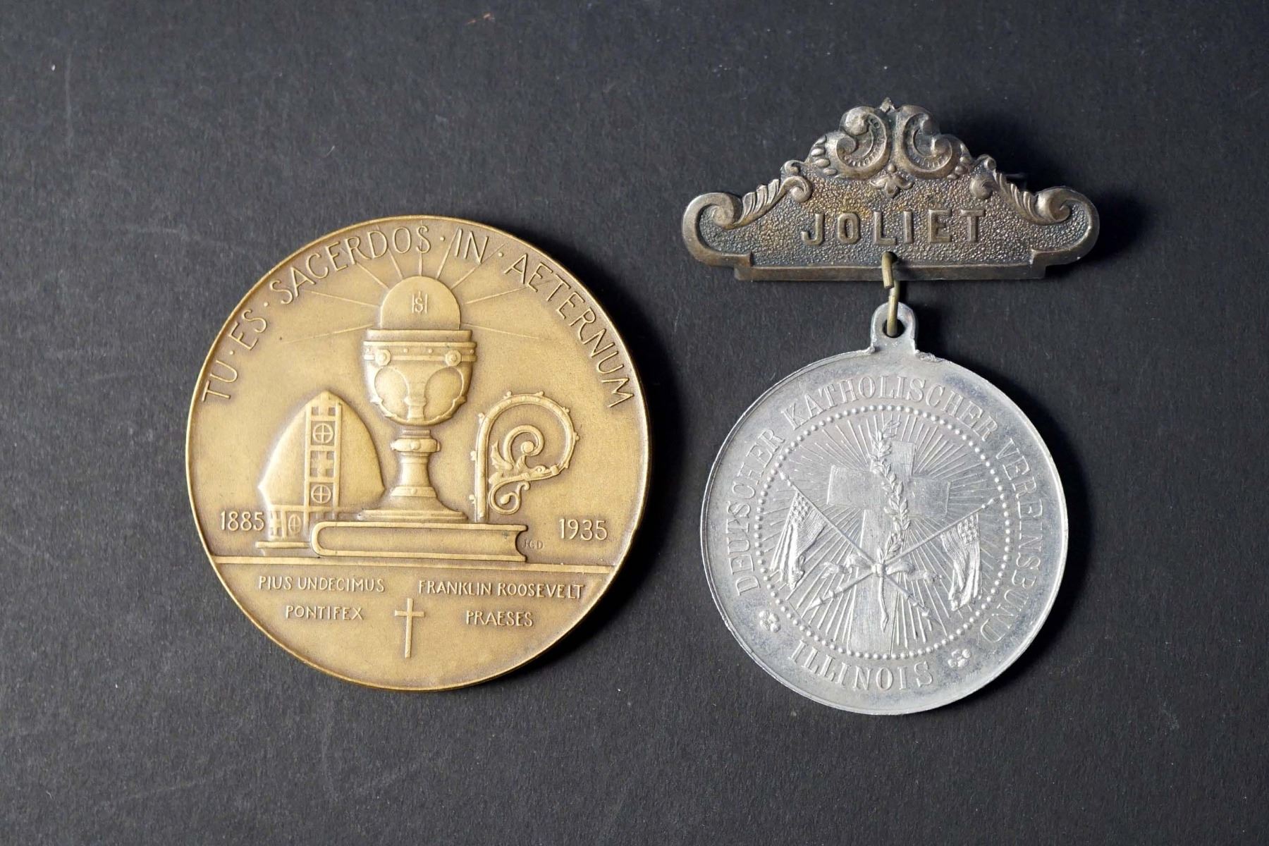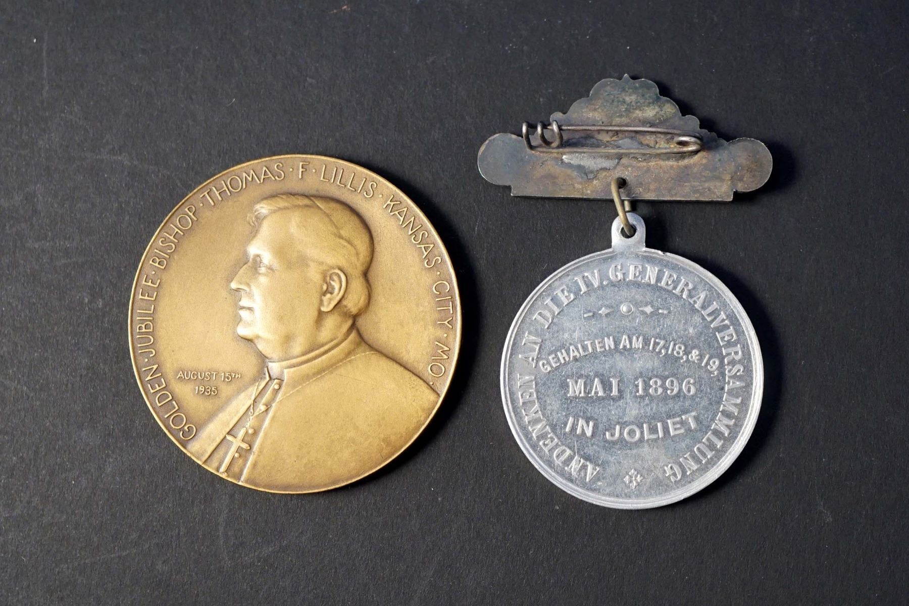 1896 IV Congress of Deutscher Katholischer Vereinsbund AL-38 w/ hanger VF and 1935 Golden Jubilee of Cardinal Thomas Lillies by Medallic Art, NY. AE-51 49.9 gms. (comes with numbered auction card )