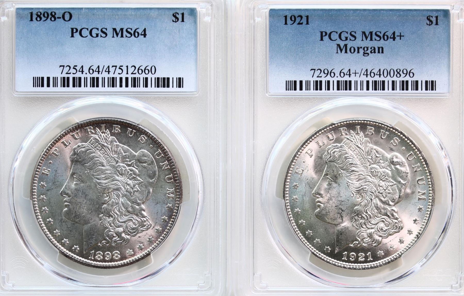 USA; 1898-O $1 PCGS MS64, 1921 PCGS MS64+ "Morgan"