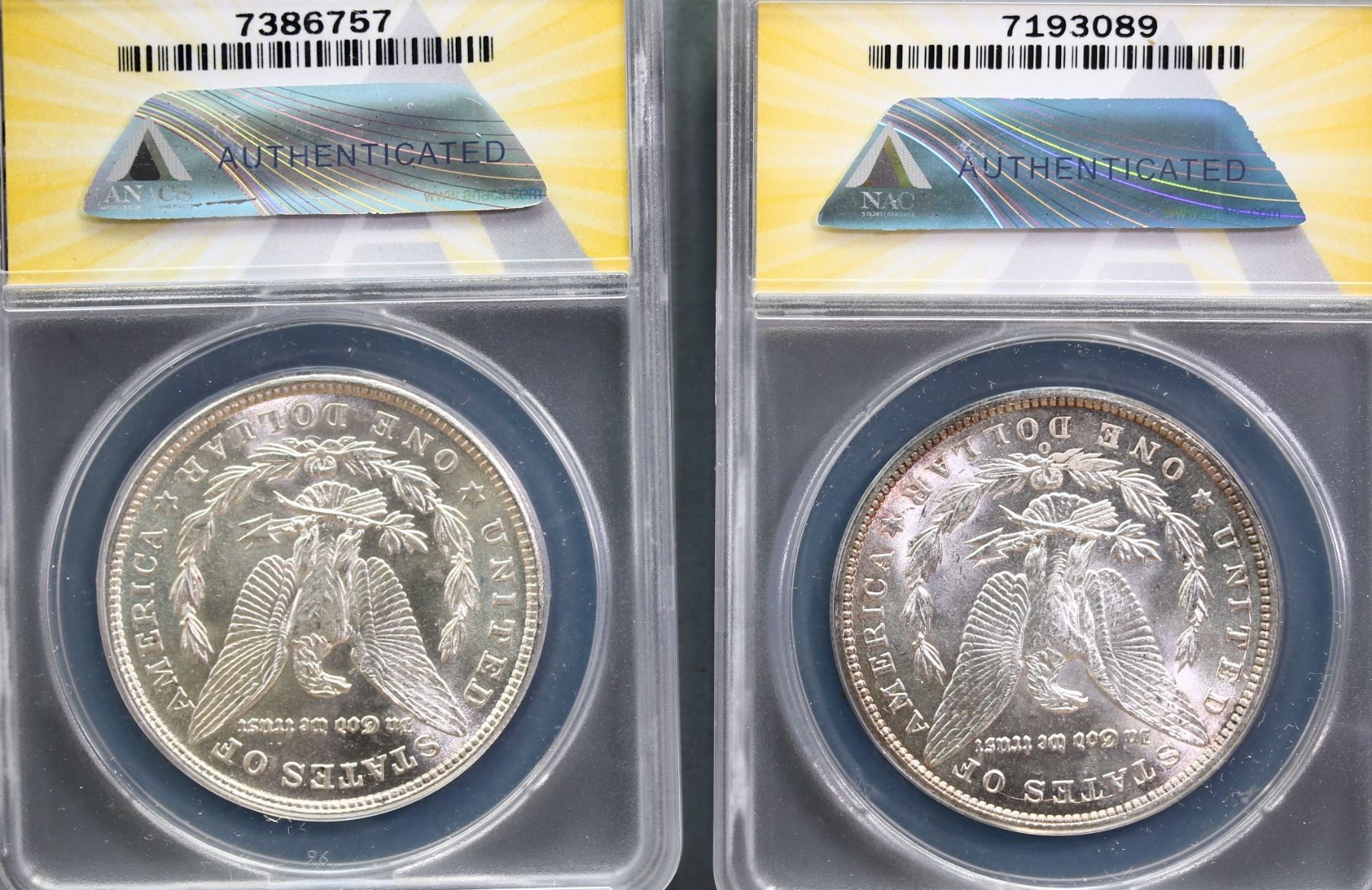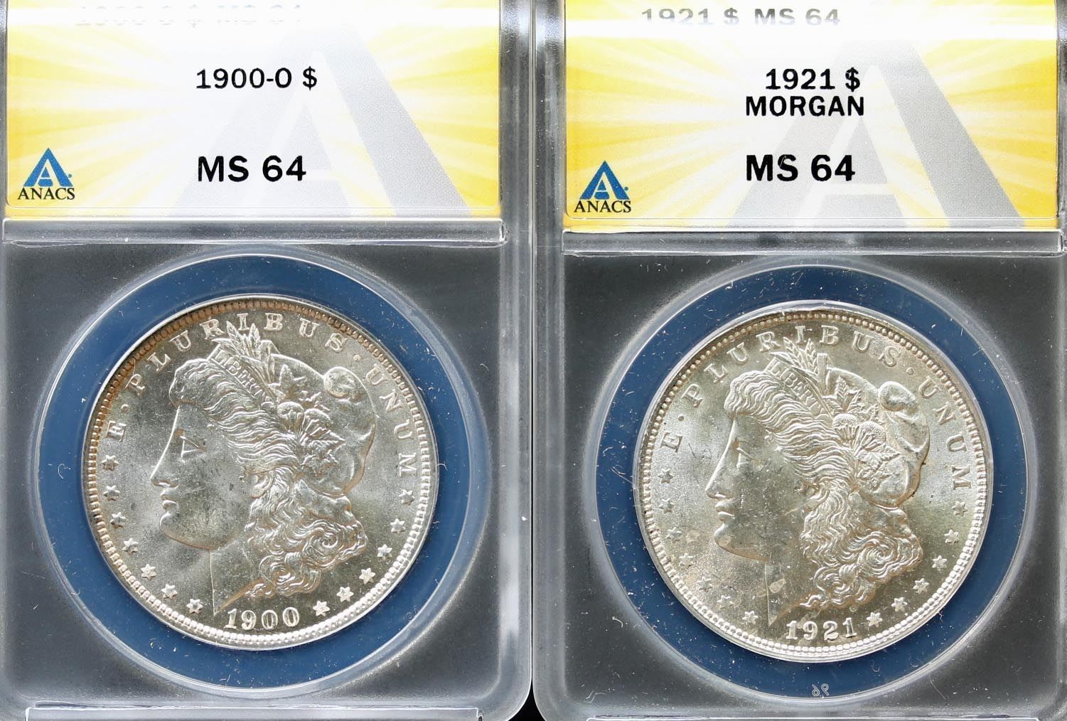 USA; 1900-O $1 & 1921 ANACS Choice Mint State-64. Lot of 2 brilliant coins.