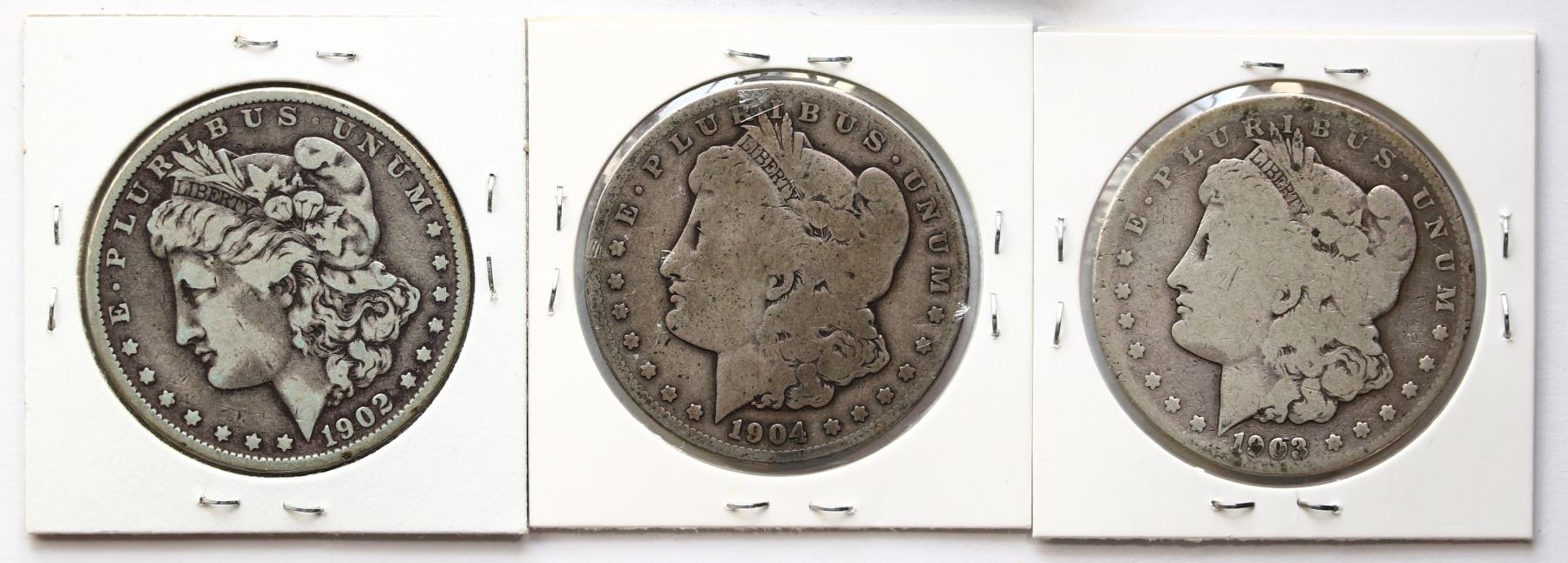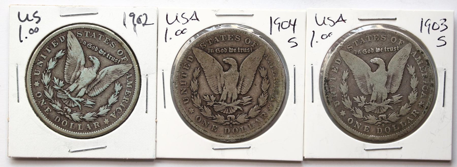 USA; 1902 $1, 1903-S, 1904-S Good to Fine. Lot of 3 coins.