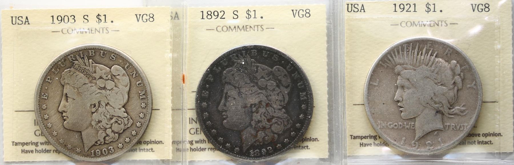 USA; 1903-S $1, 1892-S, and 1921 Peace, All 3 coins ICCS VG8.