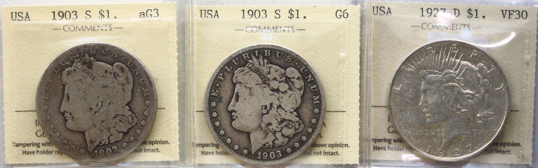 USA; 1903-S $1 aG3, 1903-S G6, and 1927-D VF30, All 3 coins ICCS graded.