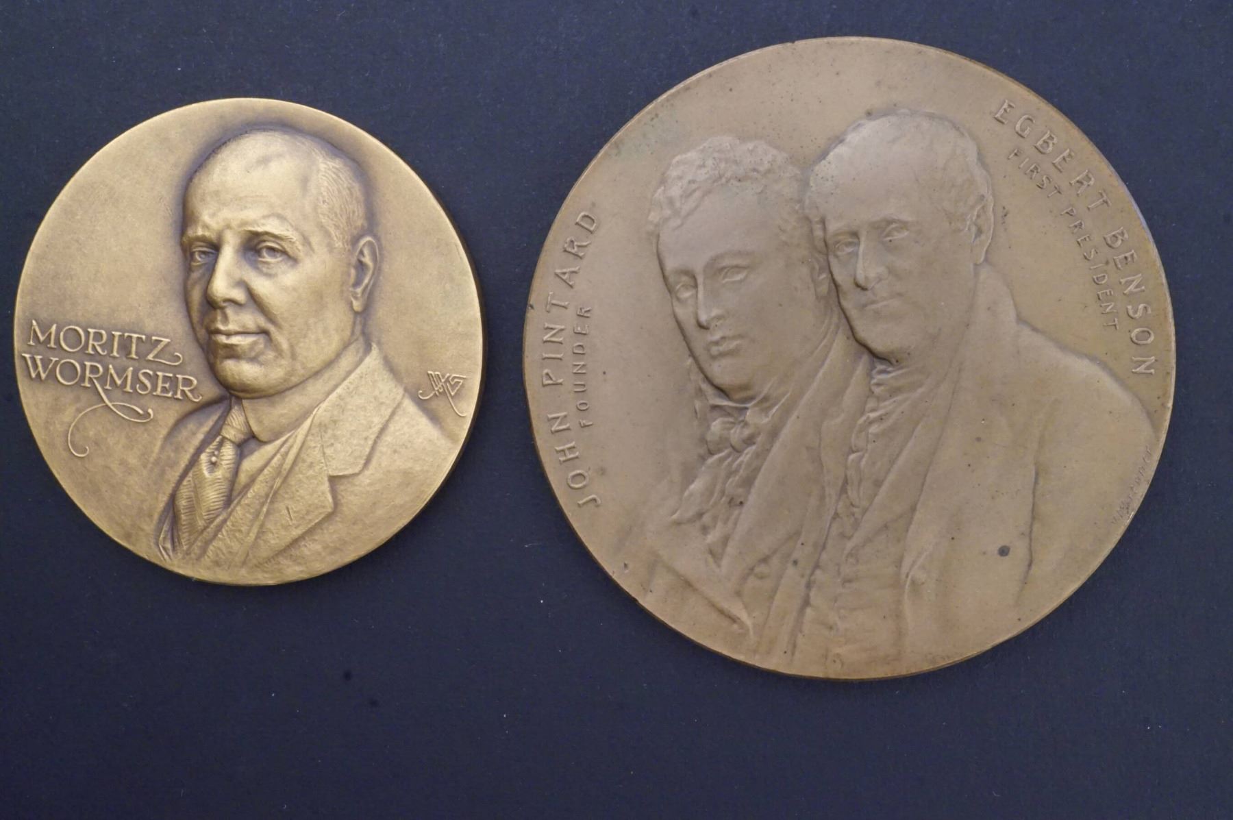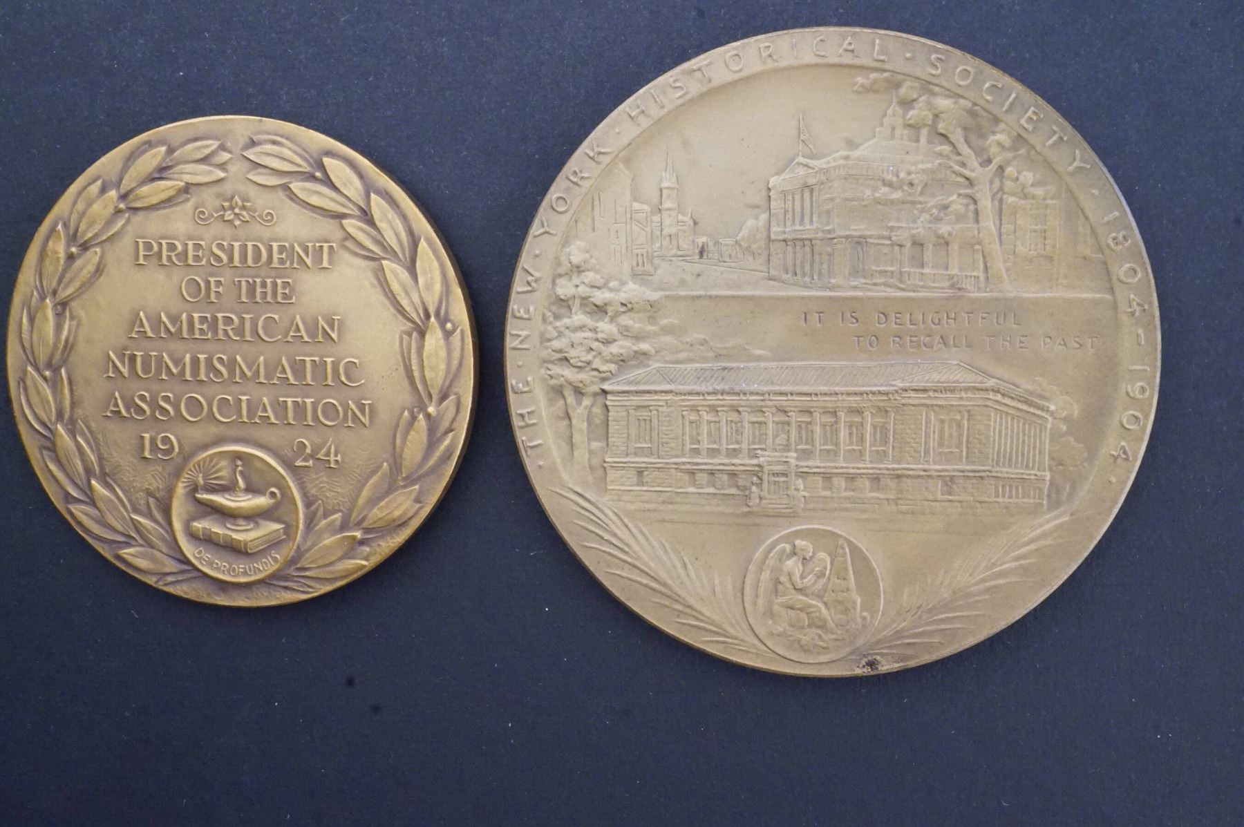 2 Pcs. New York Historical Society 100th Anniversary by V.D. Brenner FDC AE-63.5, 93.4 grs. Edge: Plain & American Numismatic Association Moritz Wormser Medal FDC AE-50.5, 50.5 grs. Edge: Medallic Art Co.