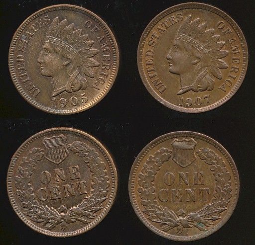 USA; 1905 1¢ & 1907 Indian Head Cents both MS RB.