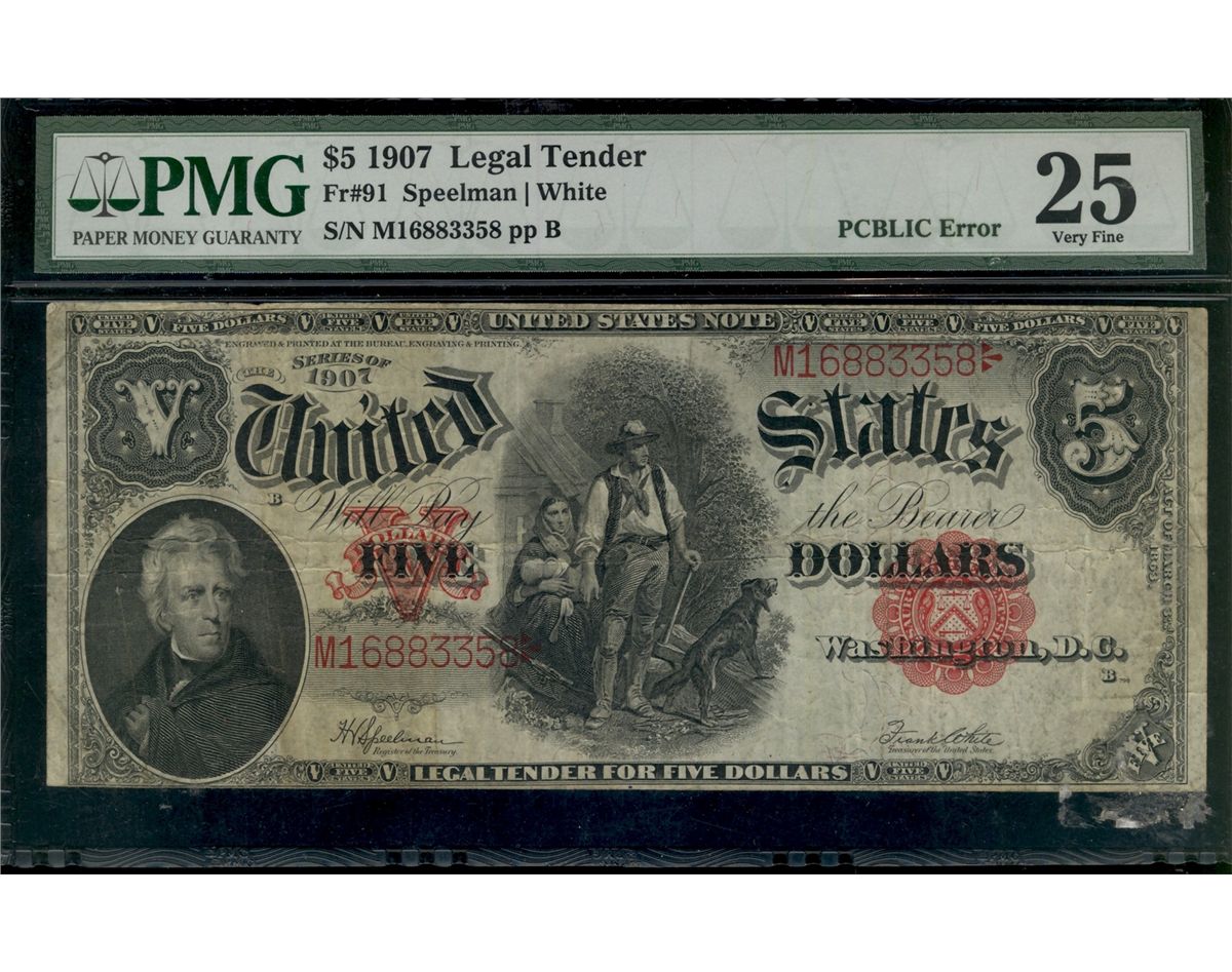 USA: 1907 $5 F-91 #M16883358, PMG VF25. Designated with PCBLIC Error. Couple pinholes.