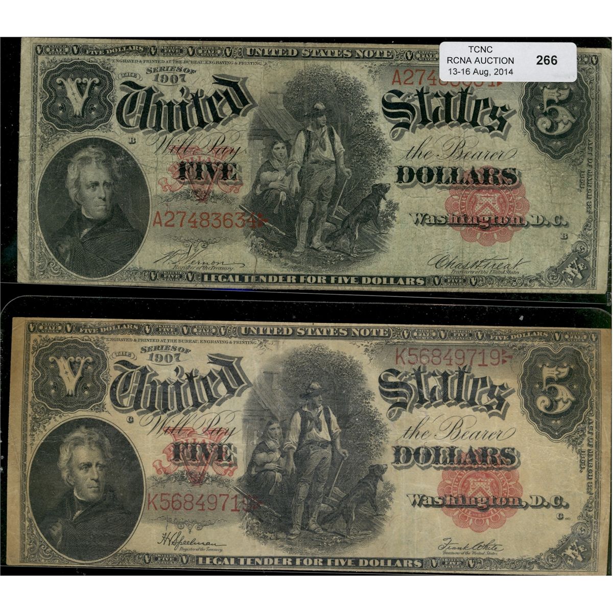 USA: 1907 $5 F83 #A27483634 & F-91 #K56849719. Lot of 2 notes Fine to F+, both with issues. Should be viewed.
