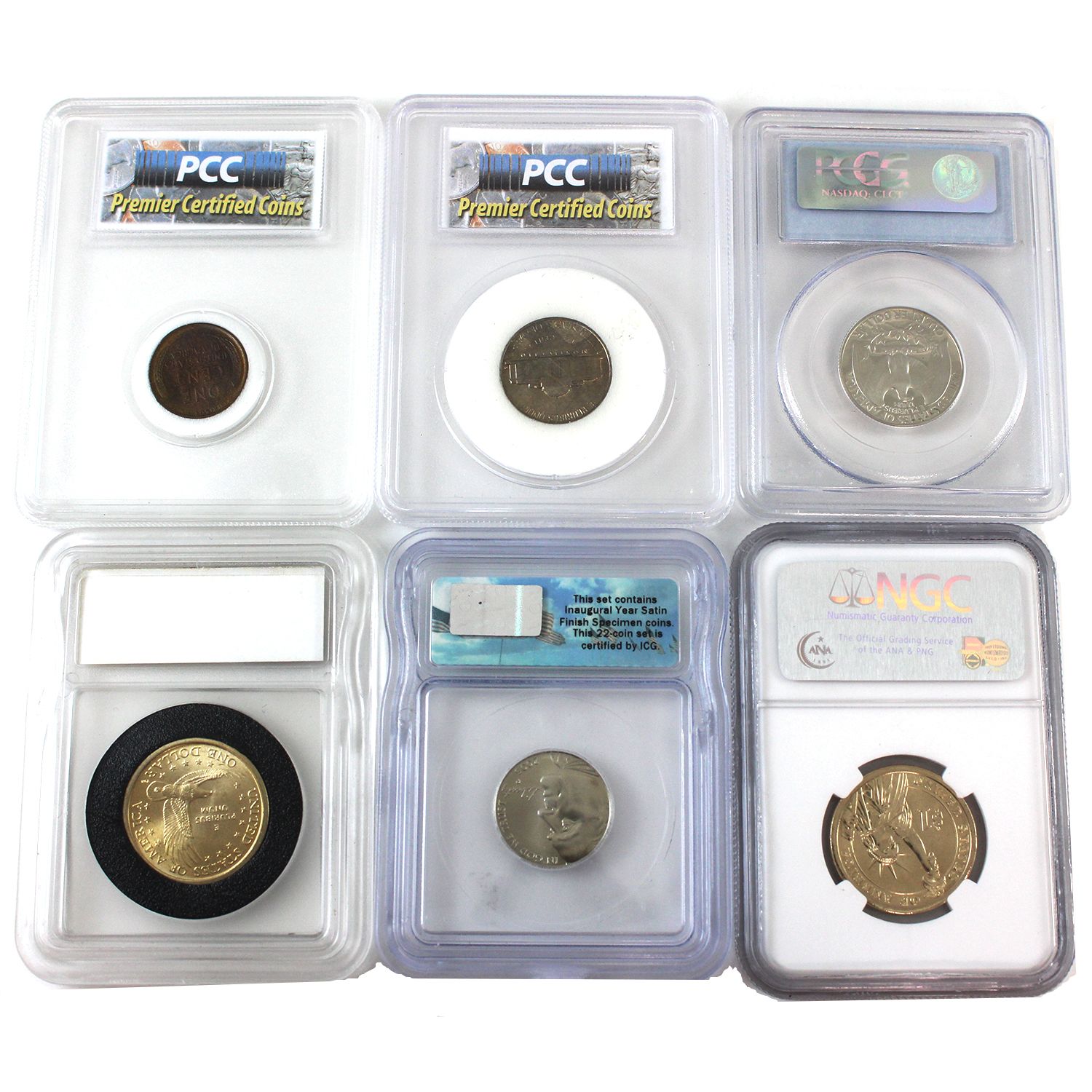 INCLUDES: 1909 Lincoln Cent Philadelphia Mint MS65 RD & BN; 1950D Jefferson Nickel Mint MS66; 1978S 25-cent PCGS PR69DCAM; 2000D Sacagawea Golden Dollar First Year; 2005P 5-cent First Strike Satin Finish ICG SP69 & 2007D $1 First President George Washington NGC BU. 6pcs.