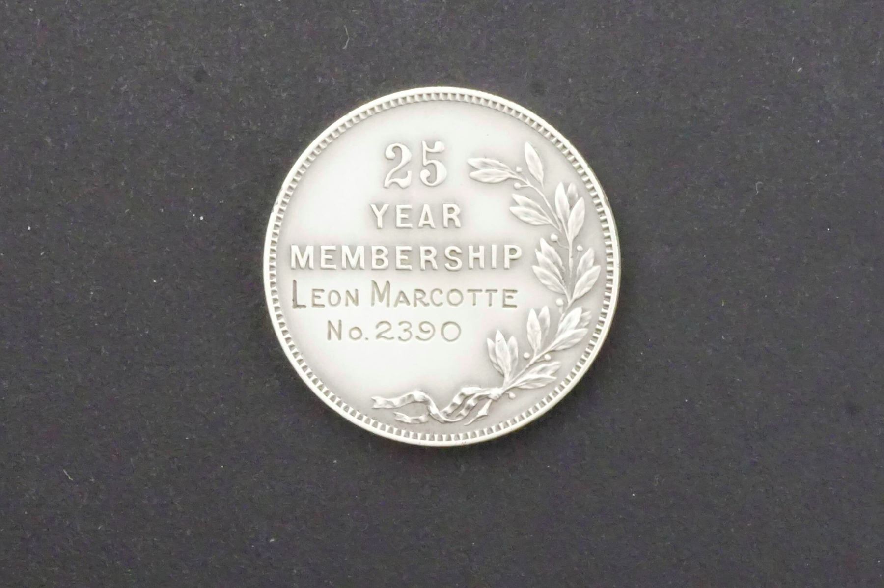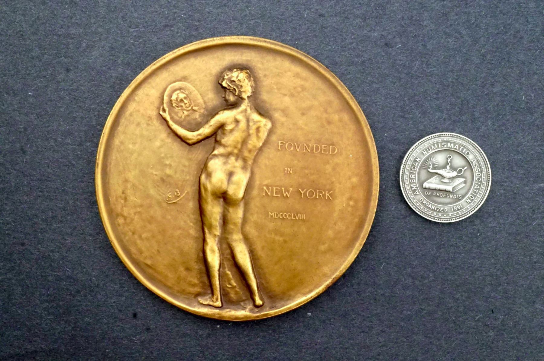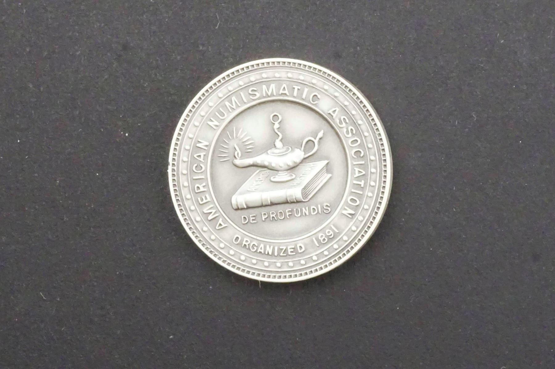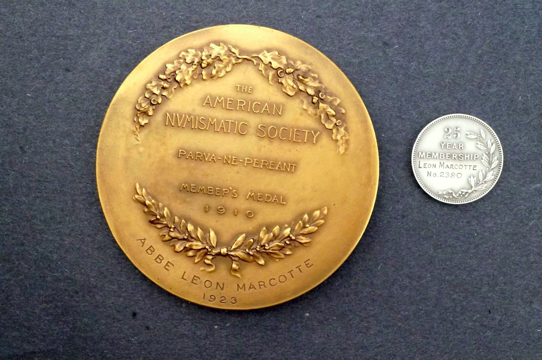 2 Pcs. American Numismatic Society Membership medal named to Abbé Leon Marcotte 1923 by Gutzon Borglum struck by Tiffany's FDC AE-77, 182.0 grs & ANA 25th Anniversary Membership medal named to Leon Marcotte #2390, Unique, UNC, AR-24, 8.6 grs.