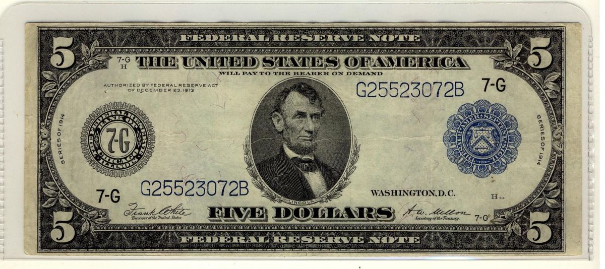 USA 1914 $5 Federal Reserve Note #G25523072B. Chicago, Blue seal, Signed by White-Mellon. Fine+ with very small tear in top border.