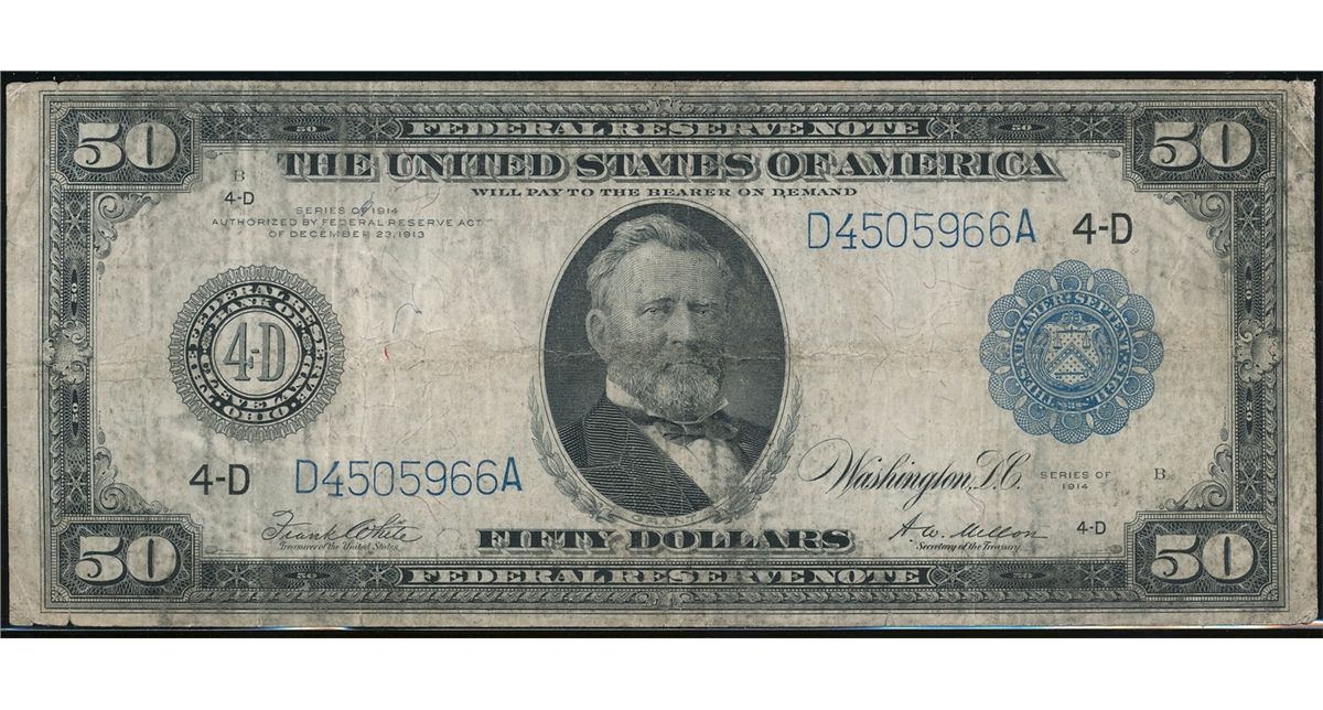USA: 1914 $50 F-1039A #D4505966A. A nice high denomination issue in VG+ grade with some minor border nicks.