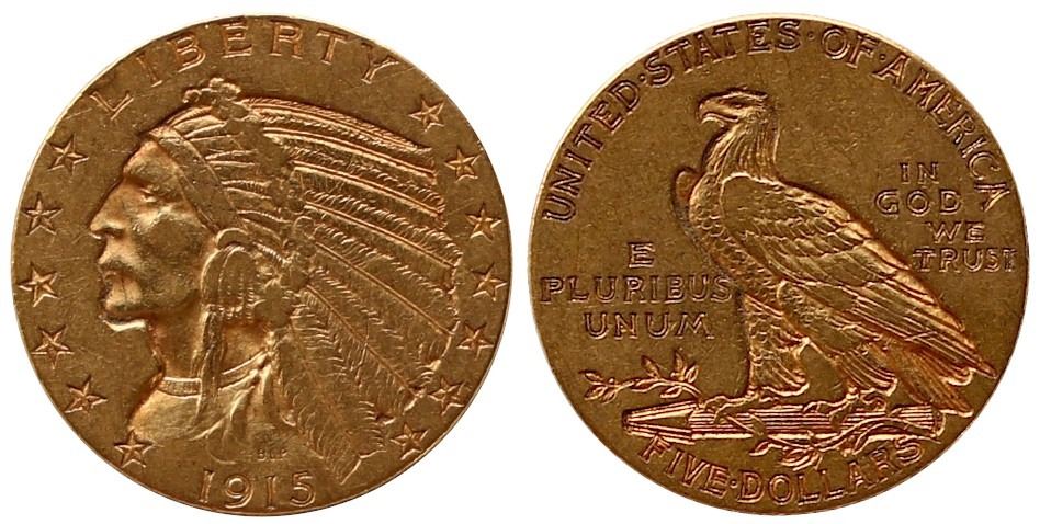 USA; 1915 $5 Gold VF or better.