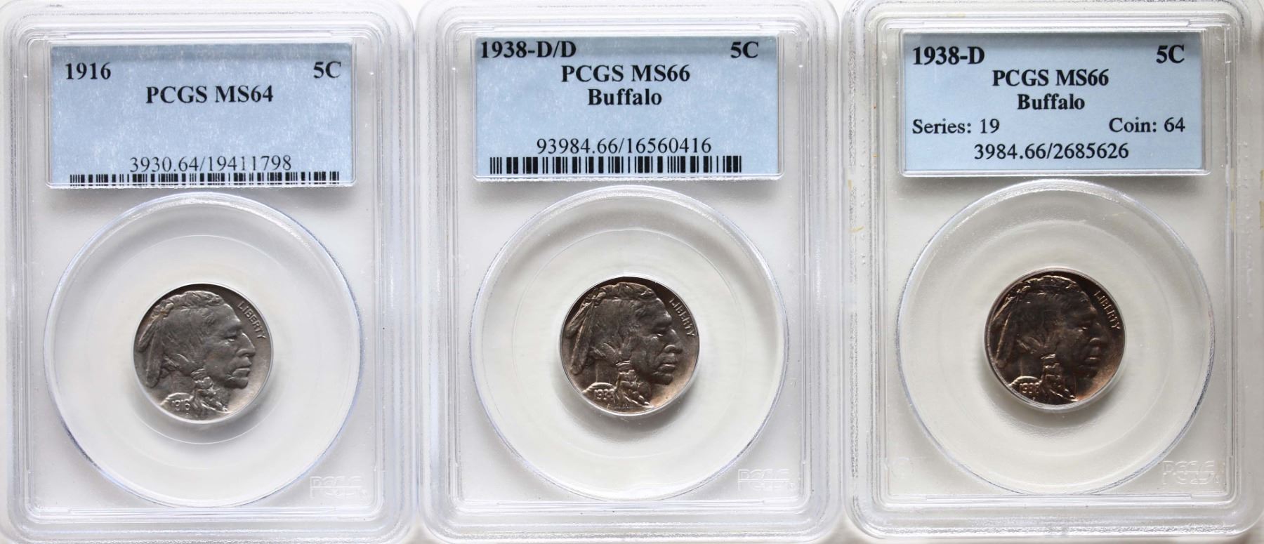 USA; 1916 5¢ Buffalo PCGS MS64,1938 D/D 5¢ Buffalo PCGS MS66, 1938 D 5¢ Buffalo series 19 coin 64 PC