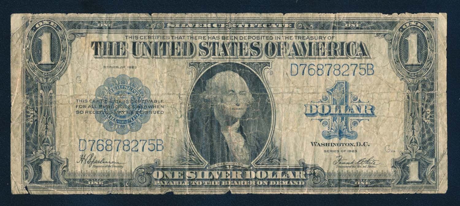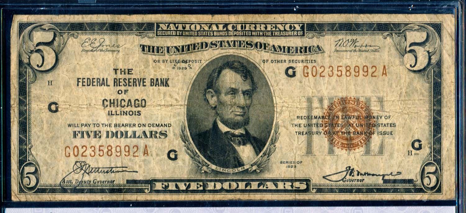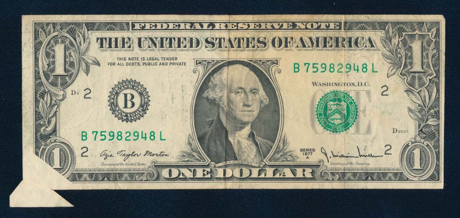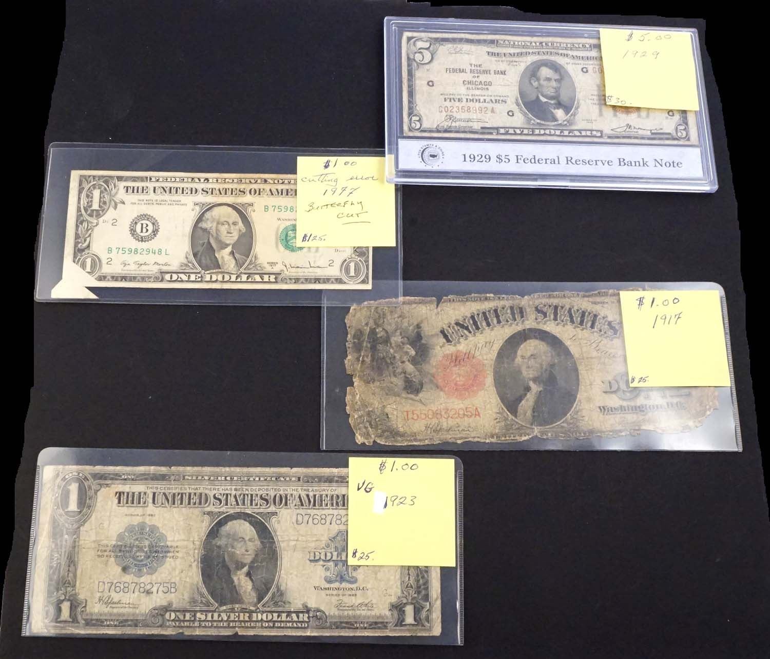 1917 $1.00 AGood, 1923 $1.00 Silver Certificate Good, 1929 $5.00 National Curency note in a PCS slab Fine and 1977 $1.00 Butterfly Cut Error Note in Very Fine. Should be viewed.