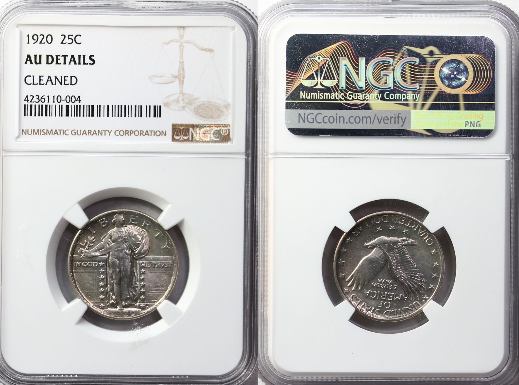 USA; 1920 25¢ NGC AU details. Designated as cleaned.