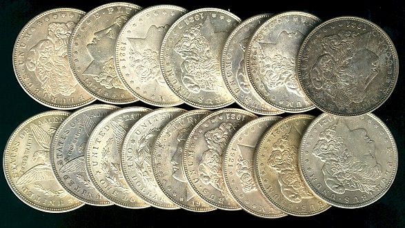USA 1921 $1; Lot of 16 Morgan Dollars, VF to UNC with a few problem issues. 3 with D mint mark & 3 with issues. 10 AU or better.