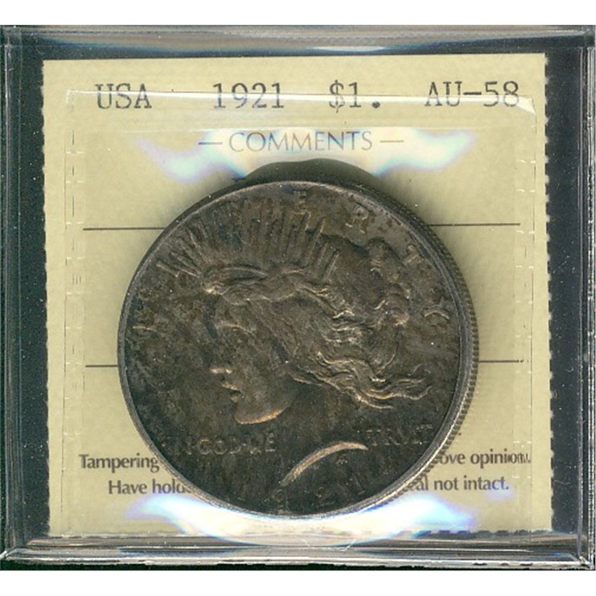 USA 1921 Peace Dollar, ICCS AU58. Key date. Attractive gold toning.