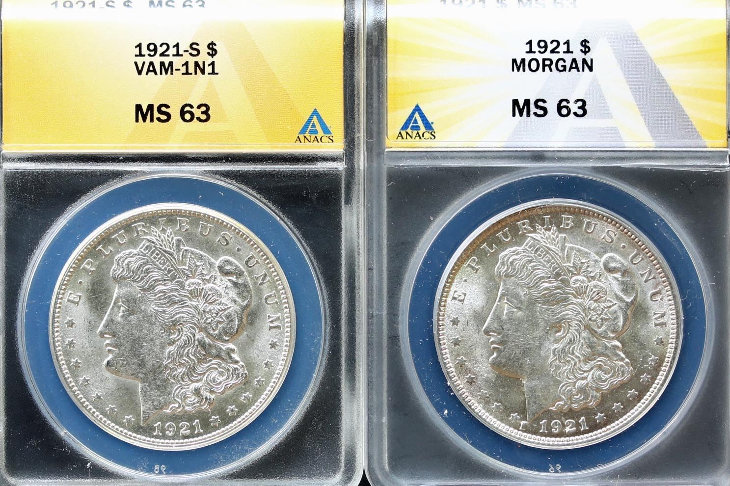 USA; 1921-S Vam-1N1 & 1921 ANACS Choice Mint State-63. Lot of 2 coins.