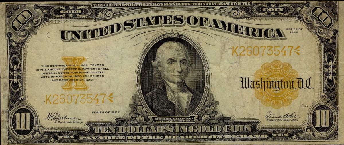 USA 1922 $10 Gold Certificate #K26073547. Speelman-White, Gold sealVG to Fine in grade with sml tear in right hand border.