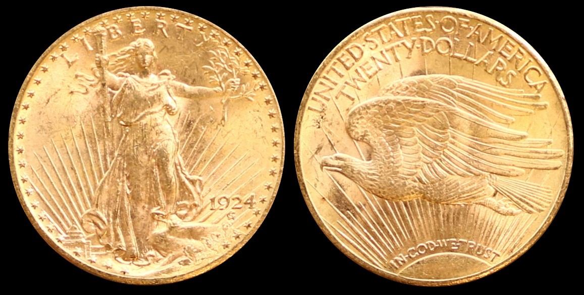 USA; 1924 $20 Gold Choice Uncirculated or better.