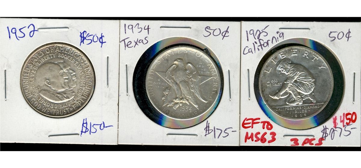 USA 1925 50¢ California, 1934 Texas & 1952 Booker T. commerative issues. Lot of 3 pcs EF to MS.