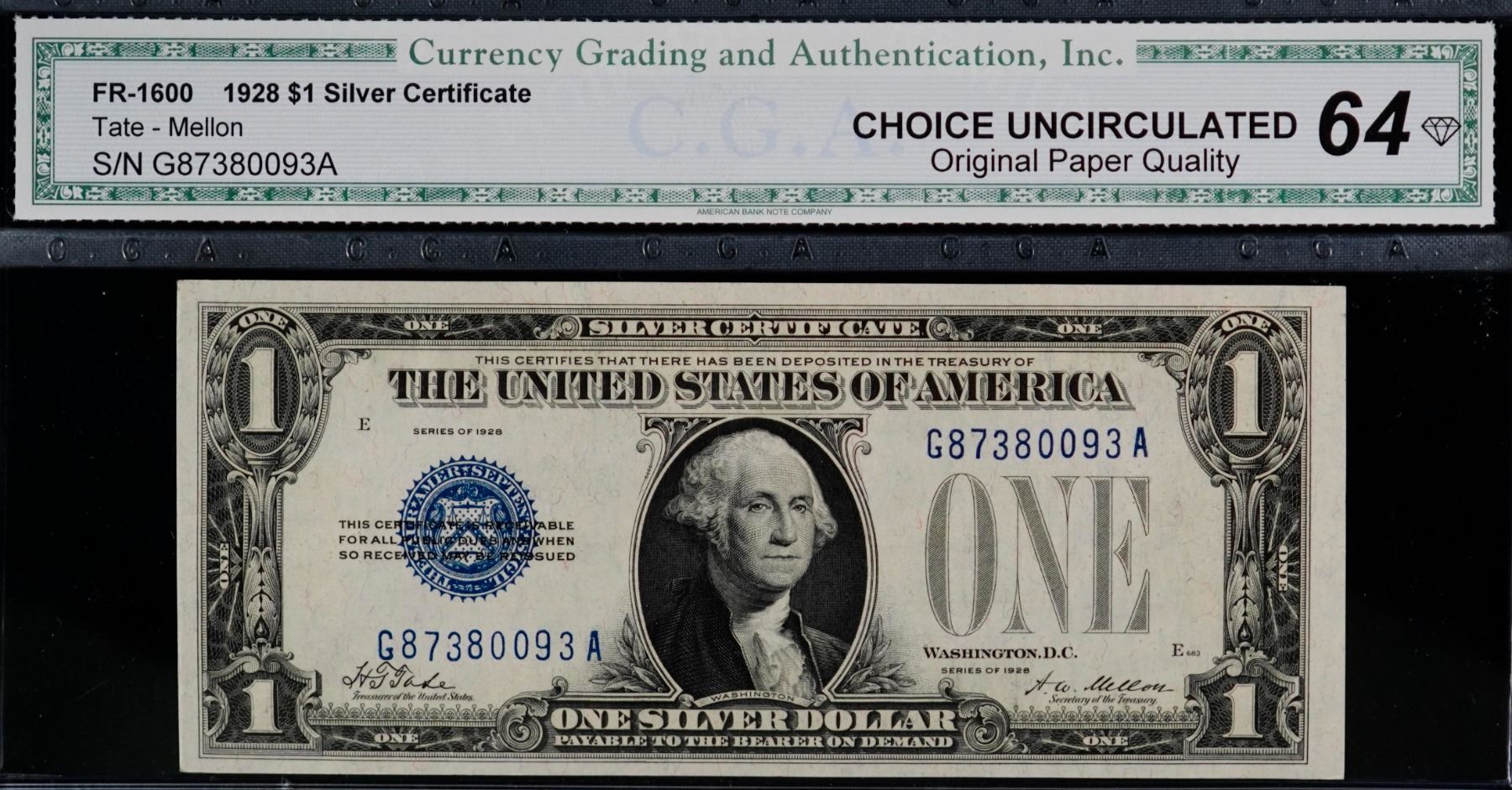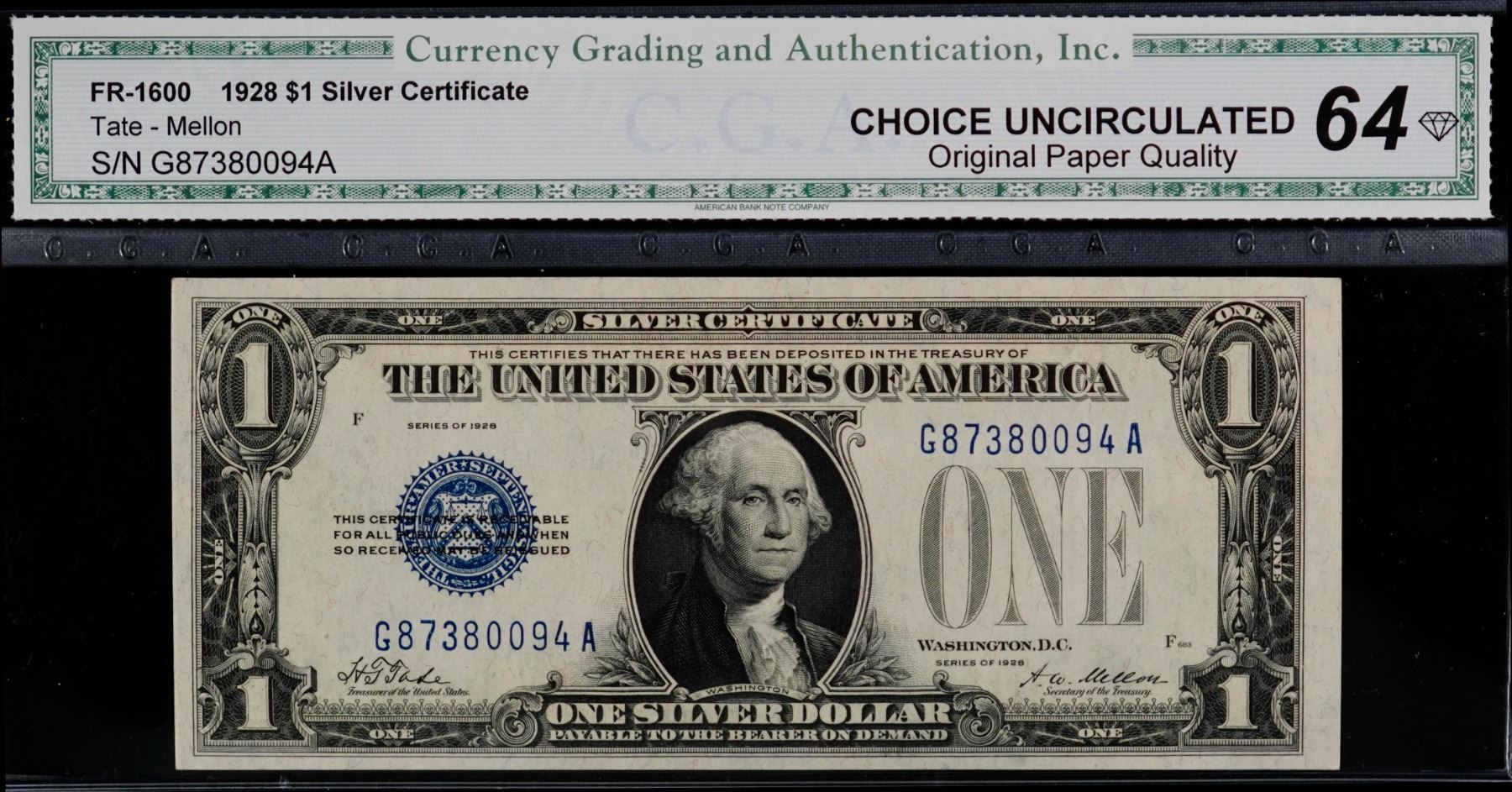 USA; 1928 $1 Fr#1600 #G87380093-094, C.G. CH UNC64 OPQ. Lot of 2 notes.