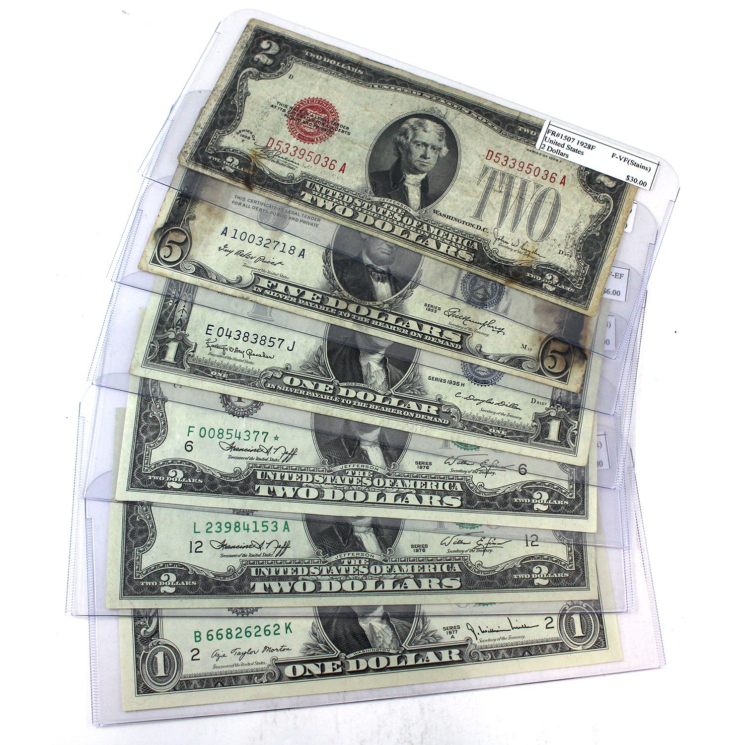 INCLUDES: 1928F FR-1507 $2 F-VF SN: D53395036A (stains); 1953 FR-1532 $5 Circ. SN: A10032718A; 1935H FR-1618 $1 VF-EF SN: E04383857J; 1977A FR-1910B $1 UNC SN: B66826262K (ink); 1976 FR1935F* $2 AU Star SN: F00854377 (trimmed) & 1976 FR-1935L $2 AU SN: L23984153A