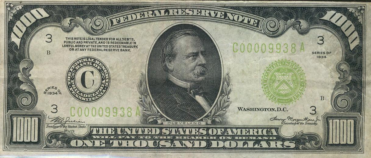 USA 1934 $1000 issue. A nice VF example.