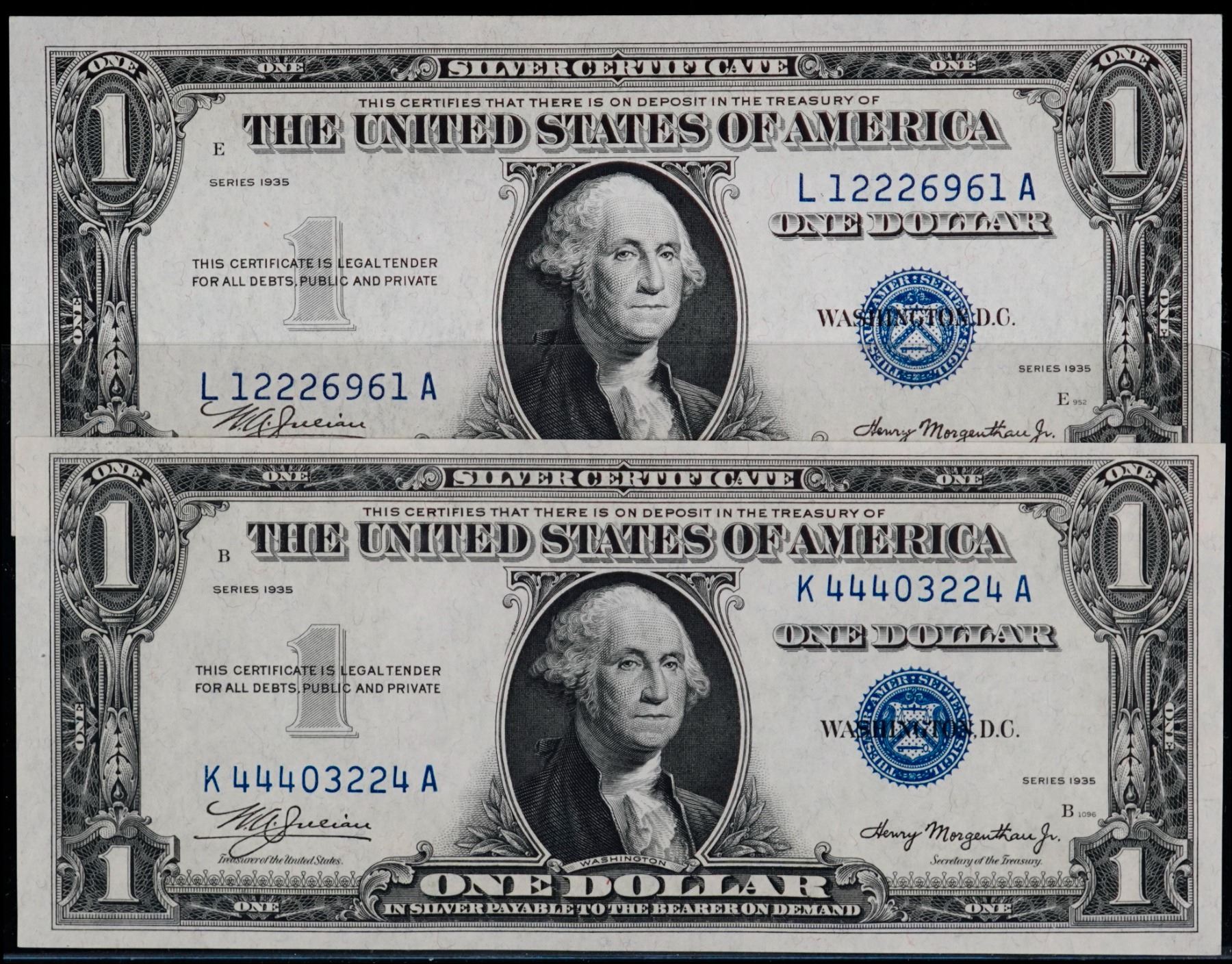 USA 1935 $1 #K44403224A, L12226961A, both UNC or better.